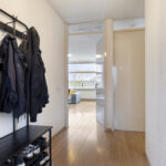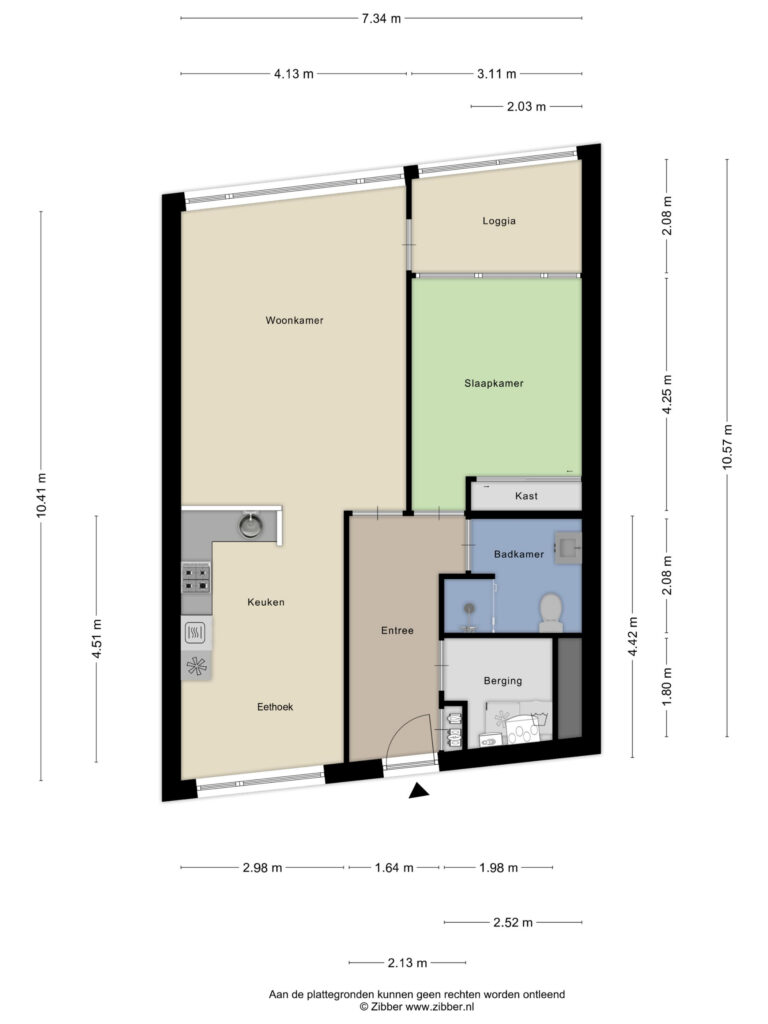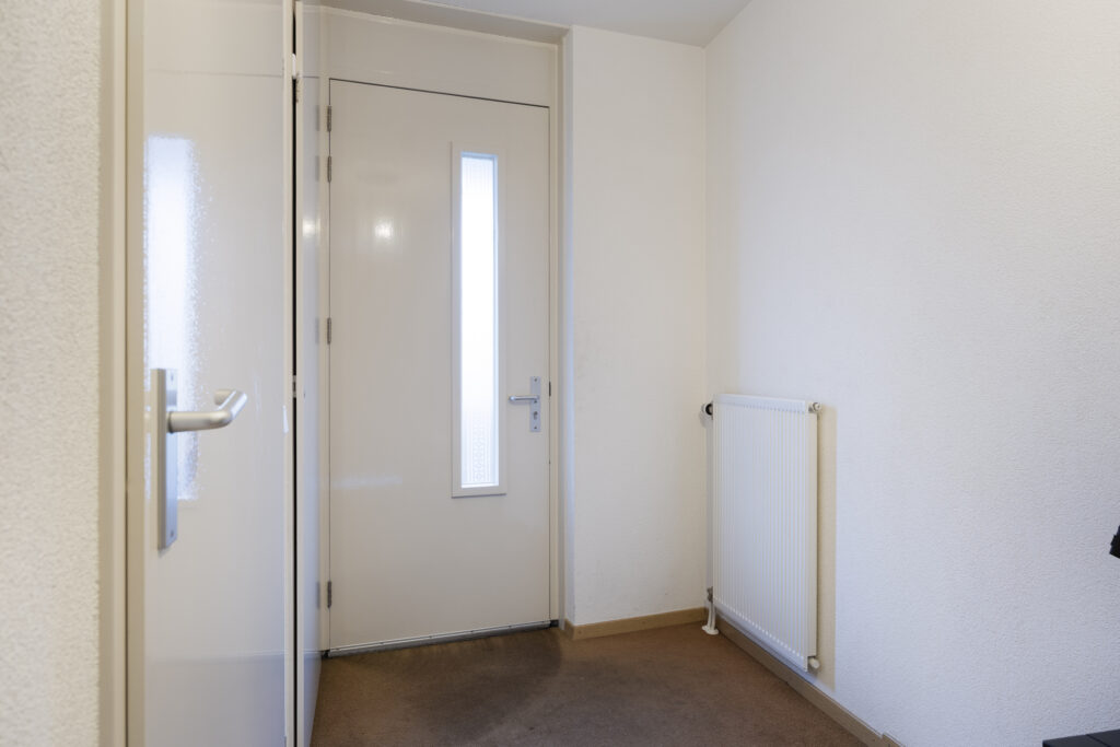 U komt binnen in de ruime hal waarin zich de meterkast, berging met aansluitingen voor wasapparatuur en cv, zich bevinden. Vervolgens is er toegang tot de badkamer, slaapkamer en woonkamer.