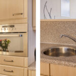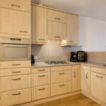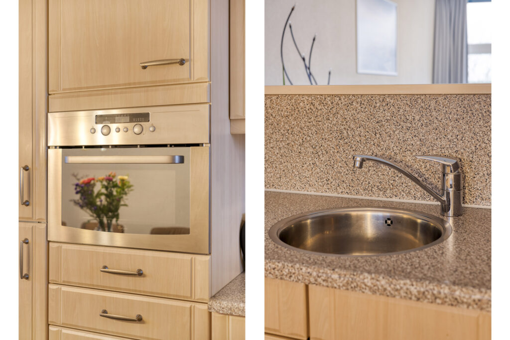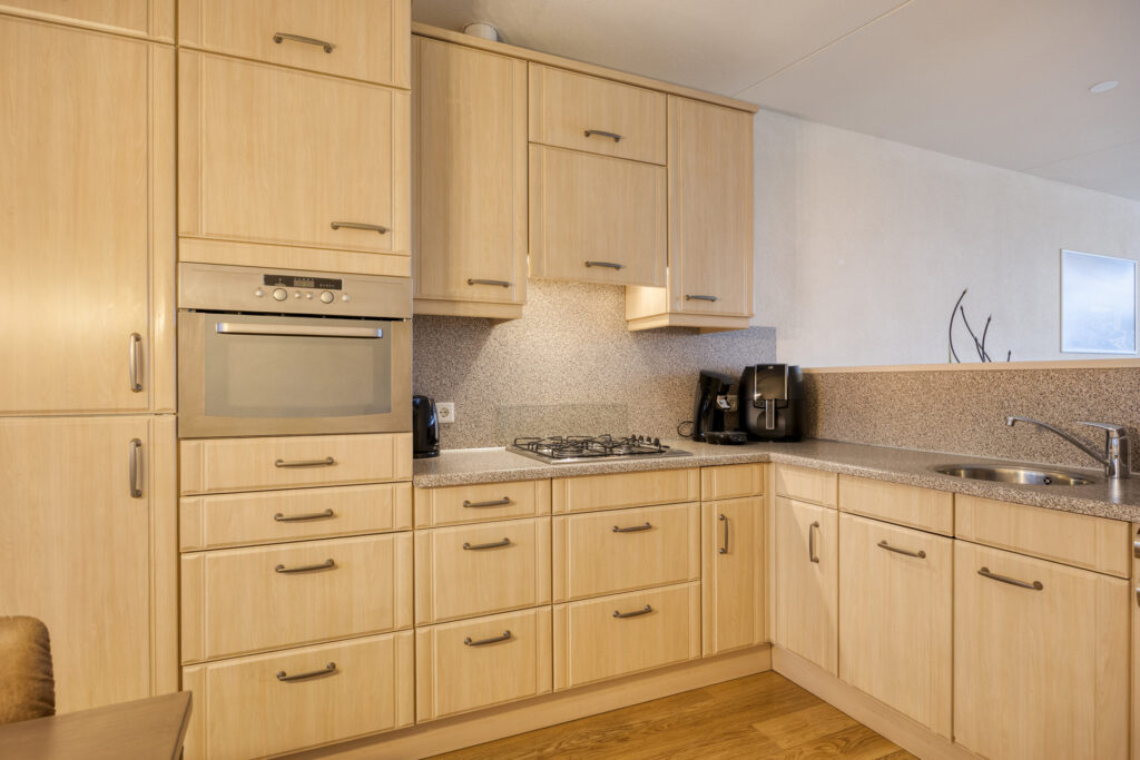Aan de woonkamer is de open woonkeuken gelegen. De keuken is voorzien van een hoekopstelling met diverse boven- en onderkasten, een kunststof werkblad en de volgende inbouwapparatuur: 4-pits gaskookplaat, afzuigkap, combi-oven/magnetron en een grote koelkast. Tevens is er in de keuken voldoende plaats voor een ruime eethoek.