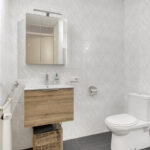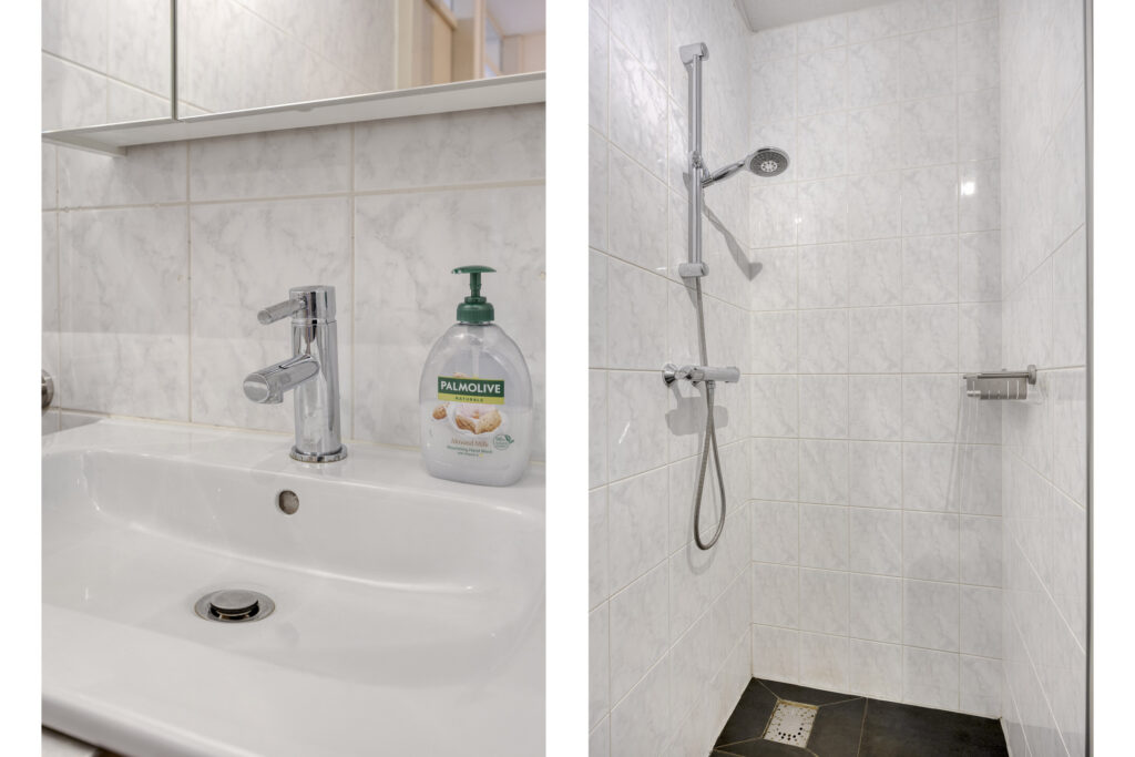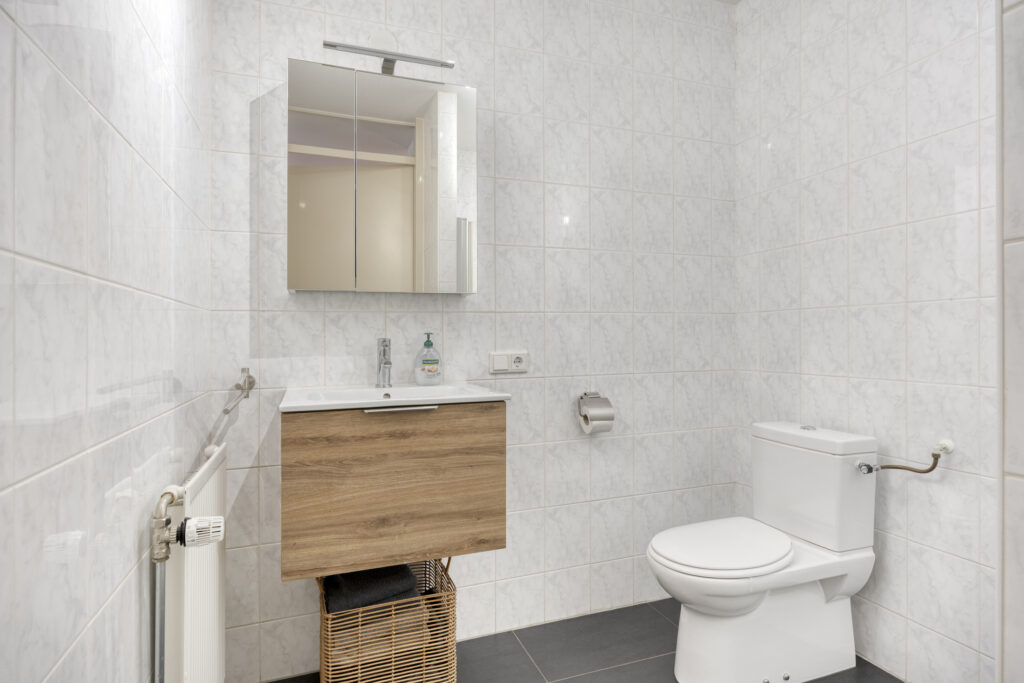 De badkamer is volledig betegeld in een neutrale kleurstelling en voorzien van een inloopdouche, toilet en wastafel in meubel.