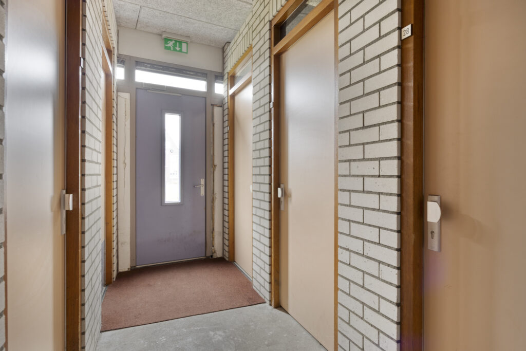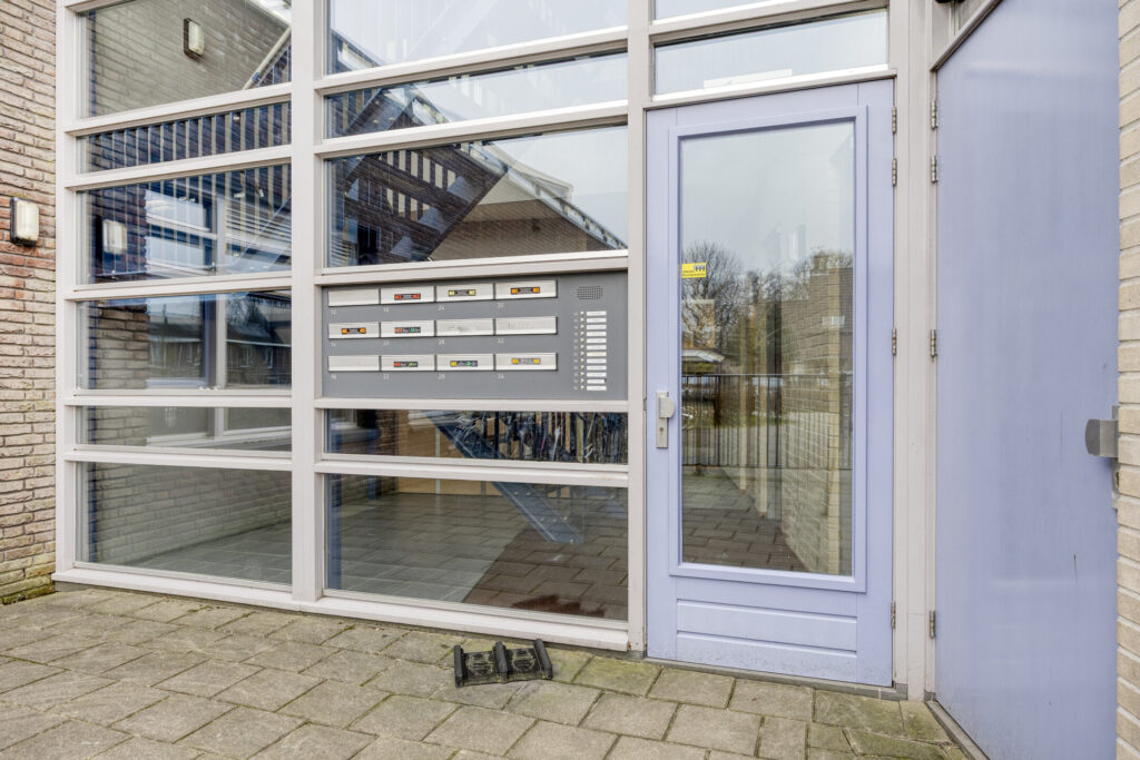 De centrale entree van het appartementencomplex is gelegen op de begane grond. Hier bevinden zich het bellentableau met intercom en de brievenbussen. Vervolgens zijn het trappenhuis en de lift bereikbaar.