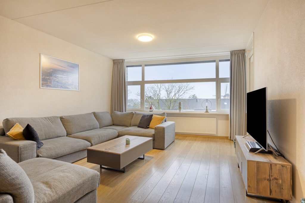 De woonkamer geniet volop lichtinval dankzij de grote raampartij met zonnescreens voor de warmere maanden. Door de grote ramen is er mooi zicht op het voorgelegen plantsoen. De woonkamer is neutraal afgewerkt met spachtelputz wanden en een neutrale laminaatvloer.