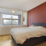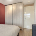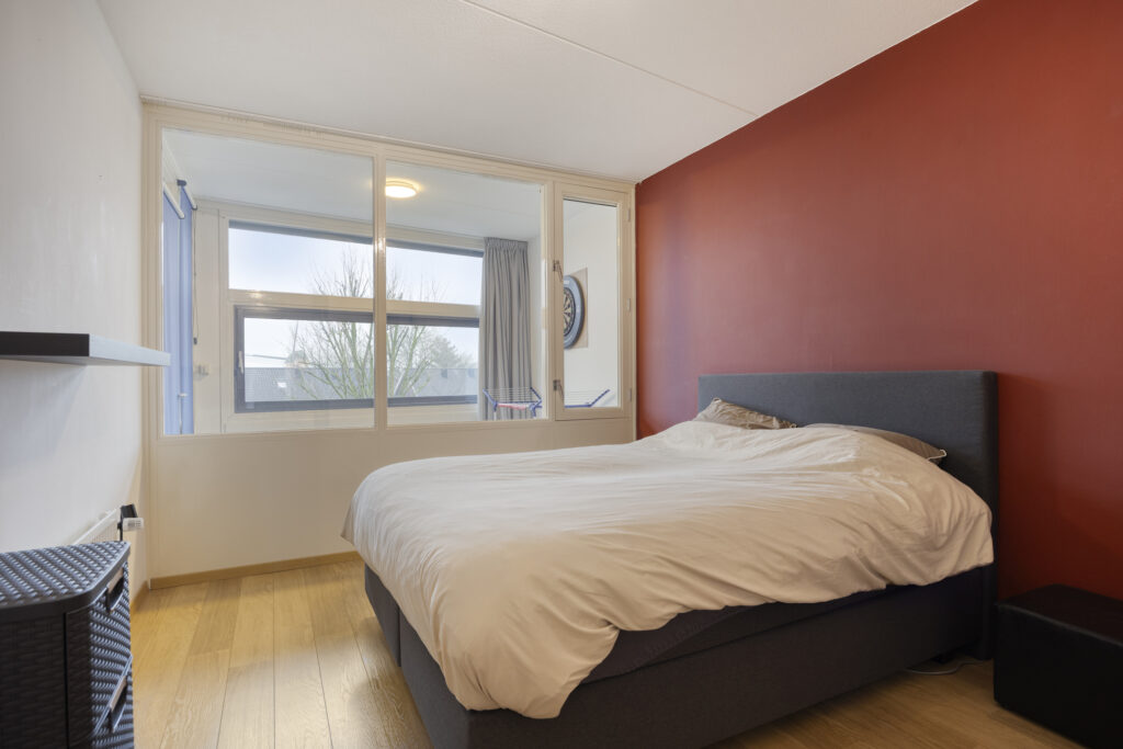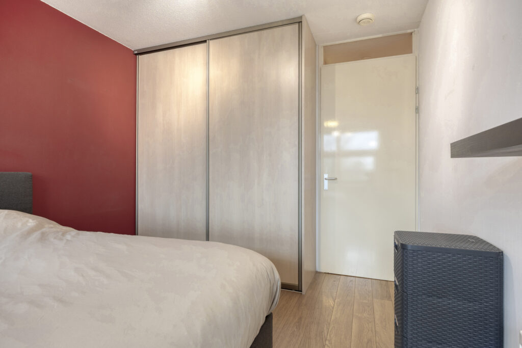 De ruime slaapkamer is voorzien van een laminaatvloer, behangen wanden en spuitwerk plafondafwerking. Een vaste kastenwand met schuifdeuren is ideaal voor de kleding.