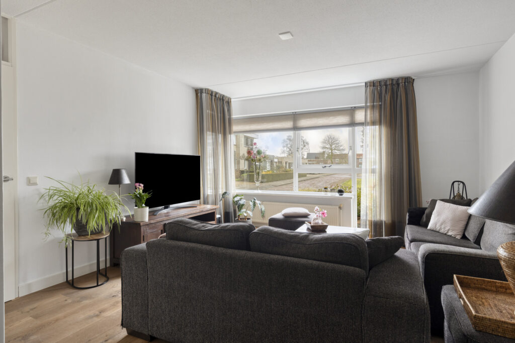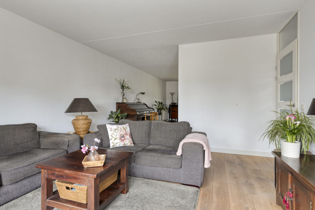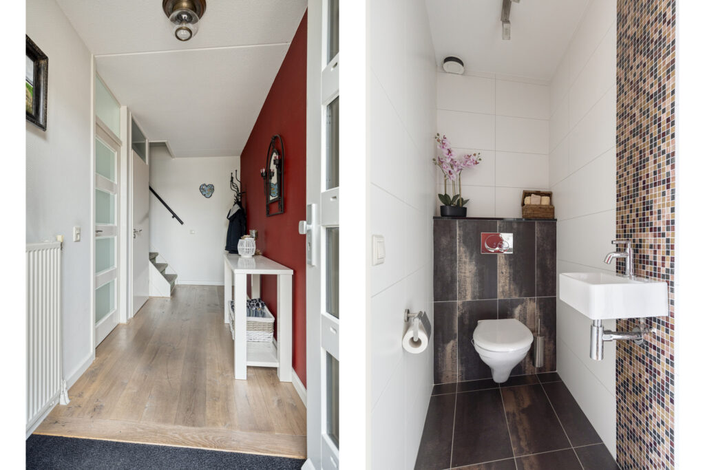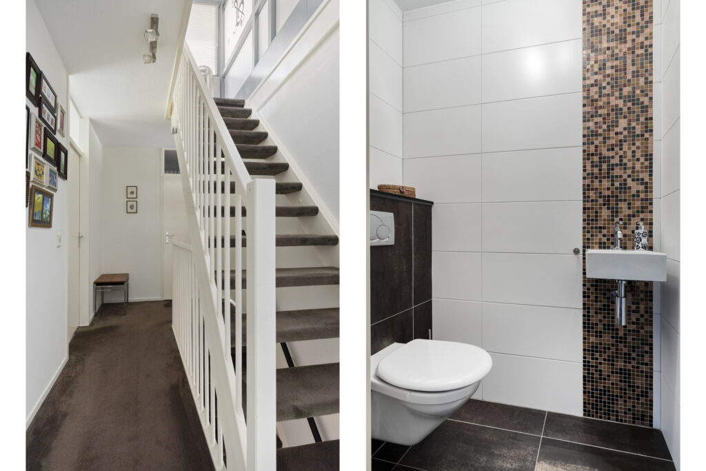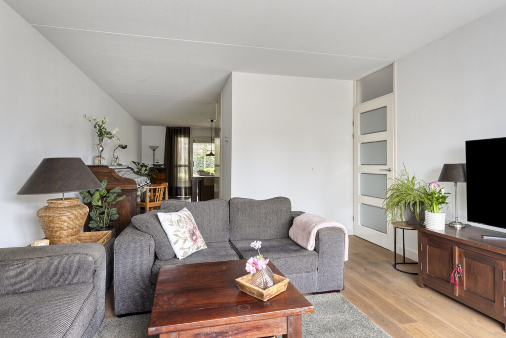 De entreehal geeft toegang tot het volledig betegelde toilet met fonteintje, de trapopgang en de woonkamer. De woonkamer is heerlijk licht dankzij de grote raampartij aan de voorzijde. Aan de achterzijde bevindt zich de eethoek met directe toegang tot de achtertuin via een schuifpui.