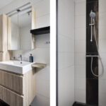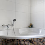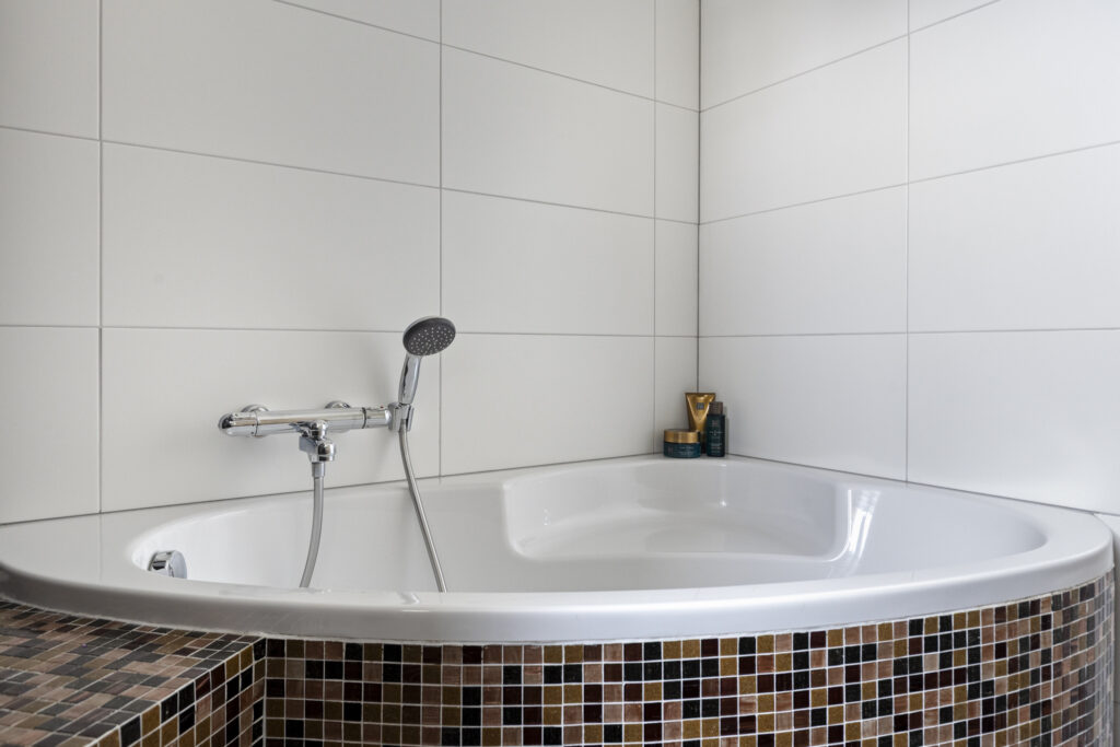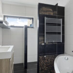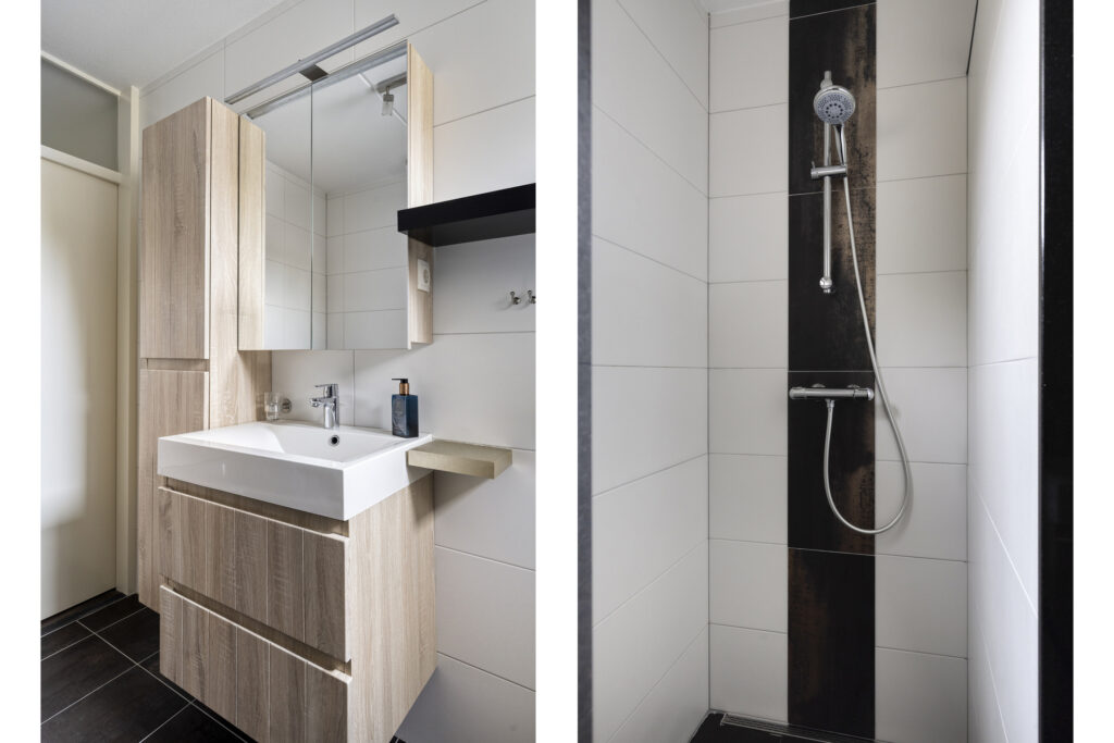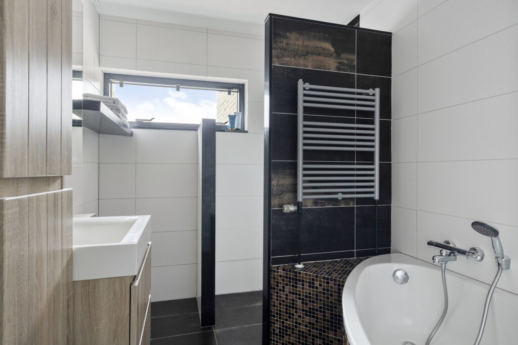 De badkamer is compleet uitgevoerd met een ligbad, inloopdouche, wastafel met meubel en mengkranen. Dankzij het aanwezige raam is er natuurlijke ventilatie en prettig daglicht.