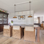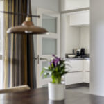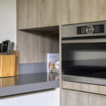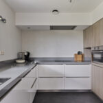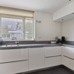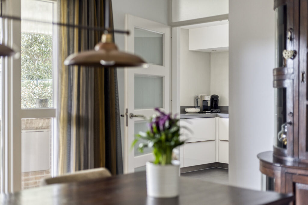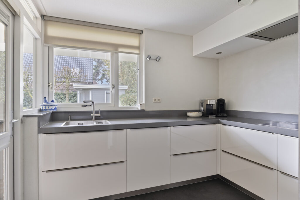 De neutraal afgewerkte keuken is uitgerust met een 4-pits inductiekookplaat, koelkast, vaatwasser en oven. Vanuit de keuken bereik je zowel de bijkeuken als de overkapping.