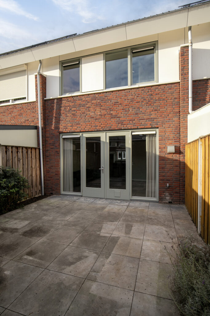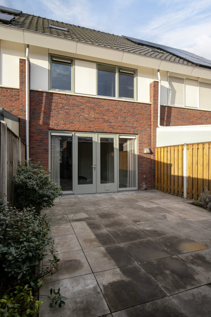 De onderhoudsarme achtertuin is aangelegd met klinkers en beschikt over een buitenkraan en een stenen tuinberging. Via de achterom heb je toegang tot het gezamenlijk terrein, dat is afgesloten met een elektrische poort. Bij de woning hoort een vaste parkeerplaats.