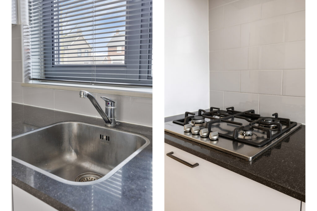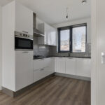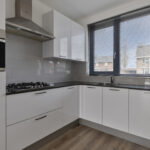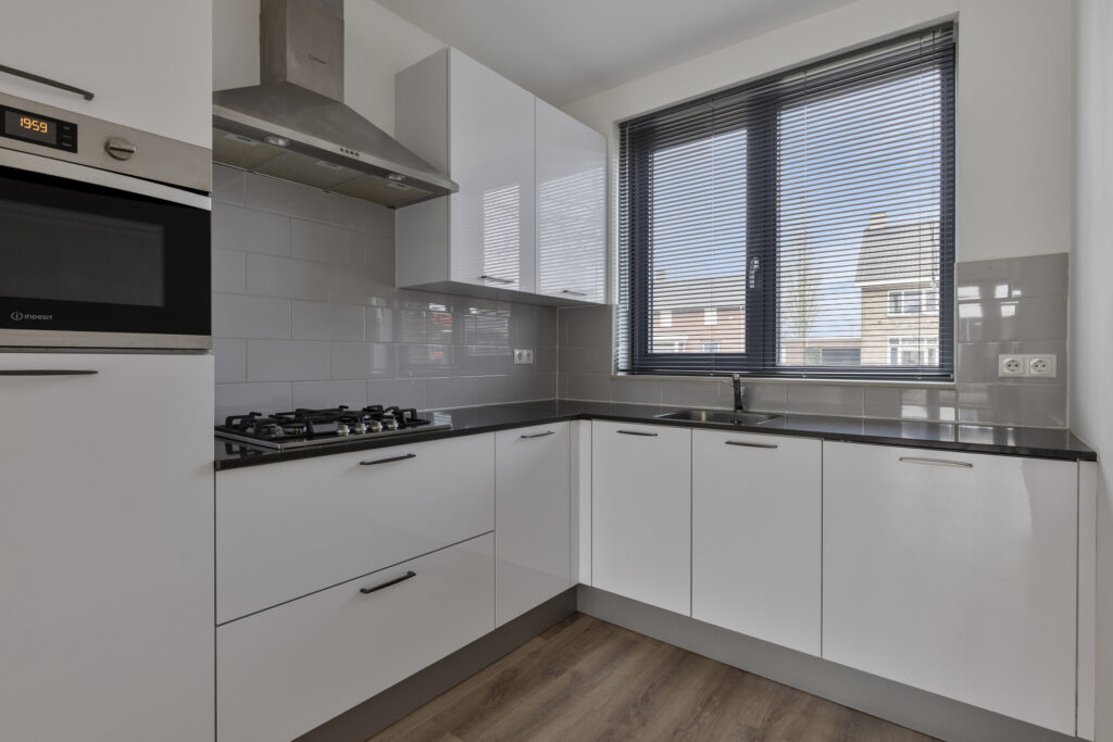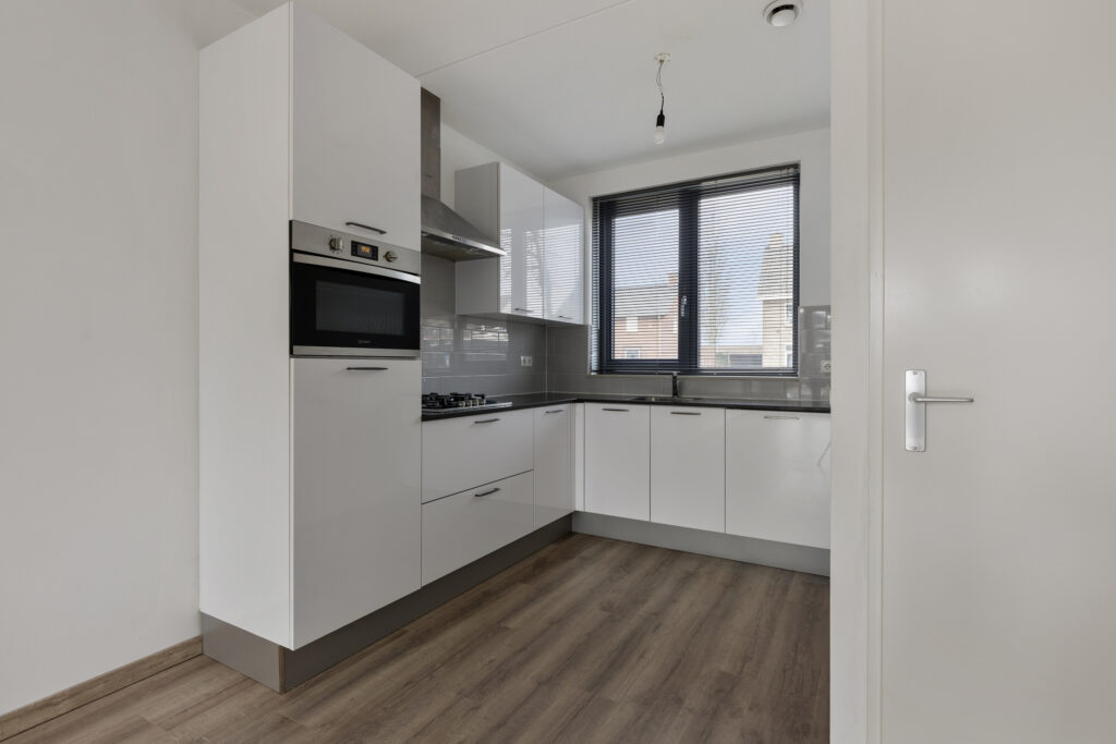 – De hoogglans witte keuken is compleet uitgerust met gaskookplaat, afzuigkap (met koolstoffilter), vaatwasser, combi-oven, koelkast en spoelbak. De keuken is afgewerkt met een composiet aanrechtblad en beschikt over diverse kasten.