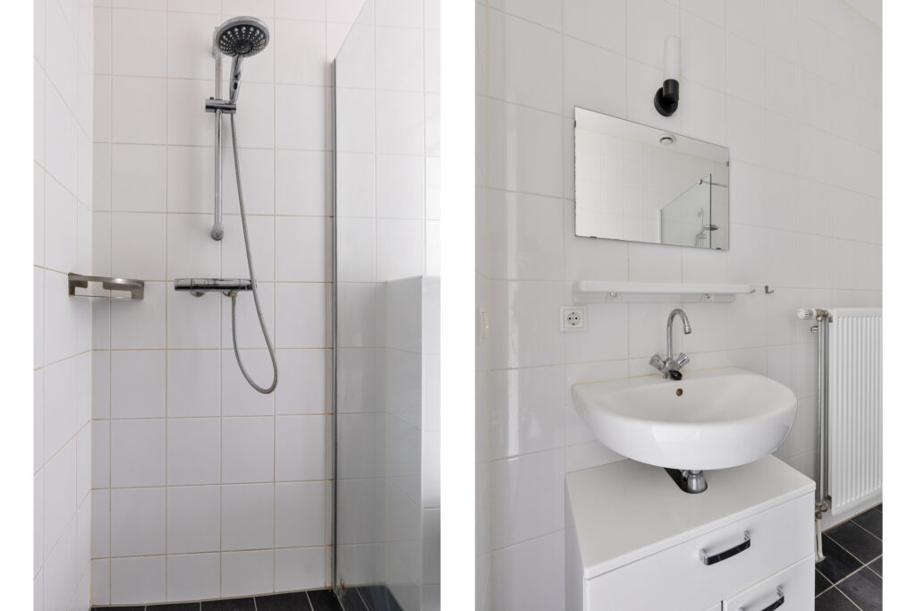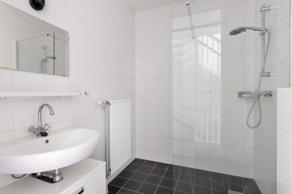 – De badkamer is volledig betegeld en voorzien van toilet, inloopdouche, wastafel, badkamermeubel en designradiator.