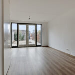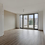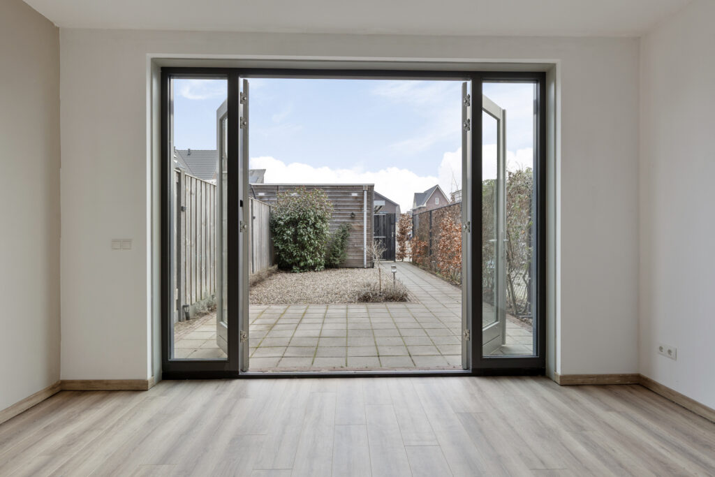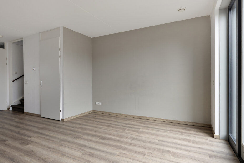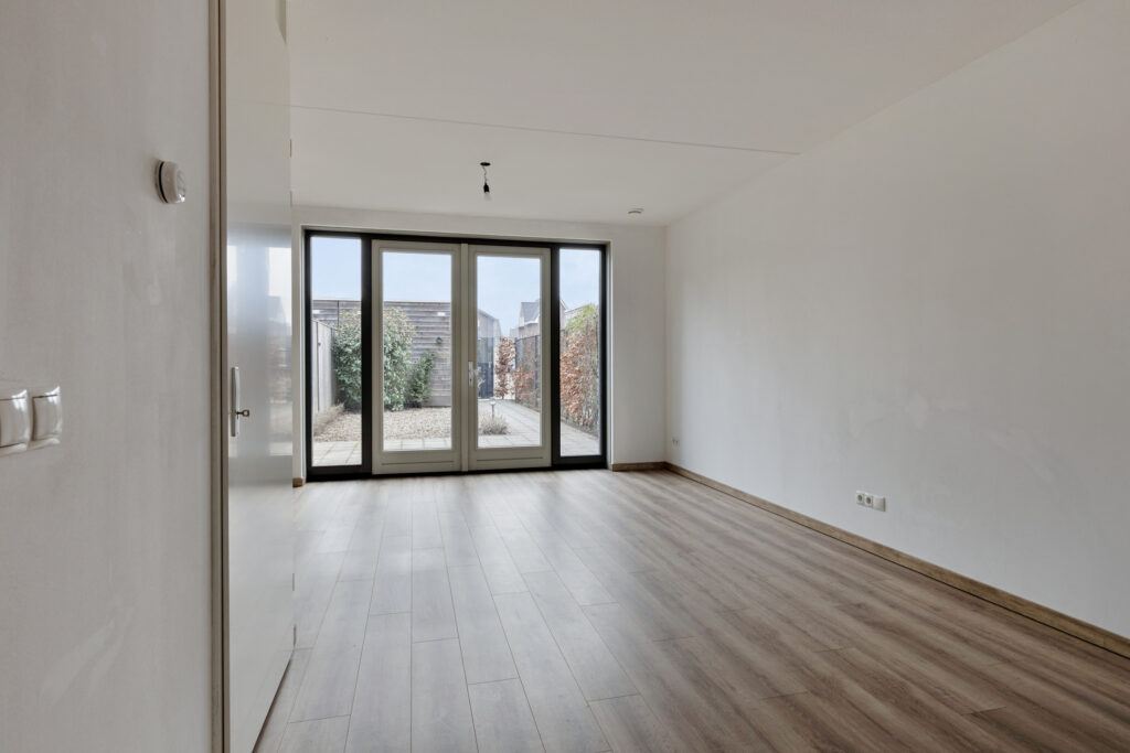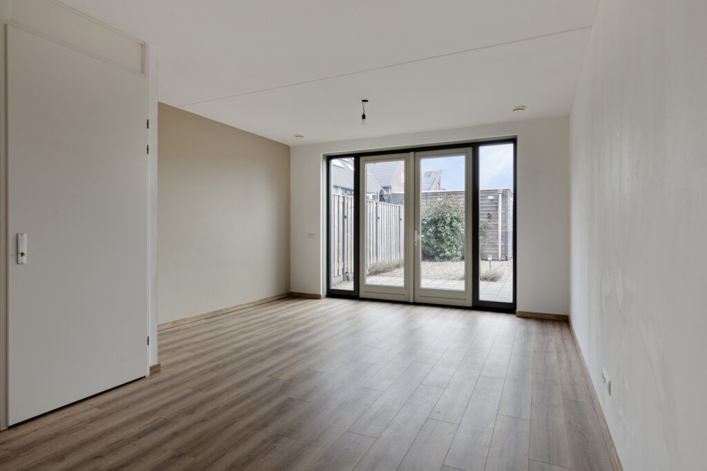 – Woonkamer aan de achterzijde van de woning, met veel daglichttoetreding en uitzicht op de achtertuin via de openslaande tuindeuren.