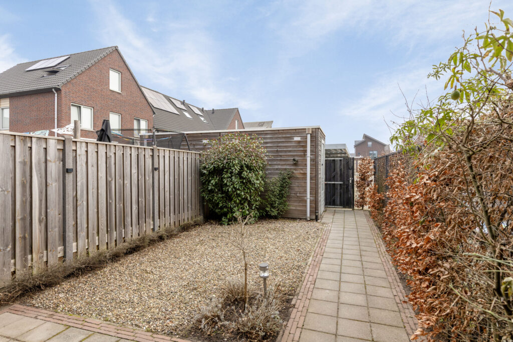 – De tuin is verzorgd aangelegd met bestrating en een grindborder.
