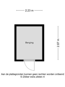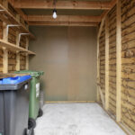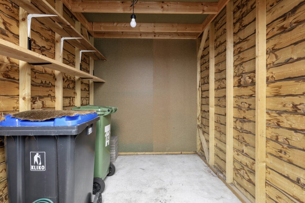 – Houten berging met elektra, met daarnaast een achterom.