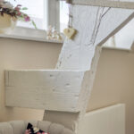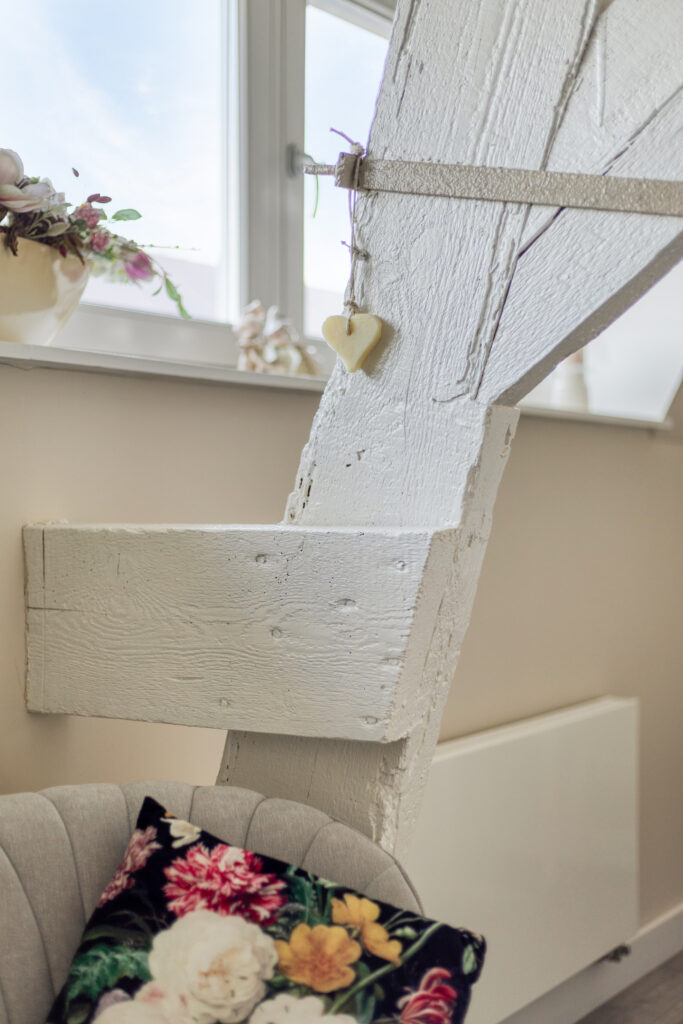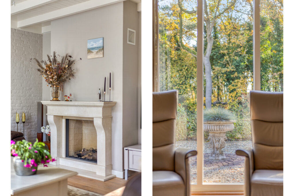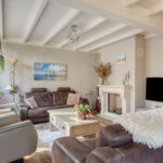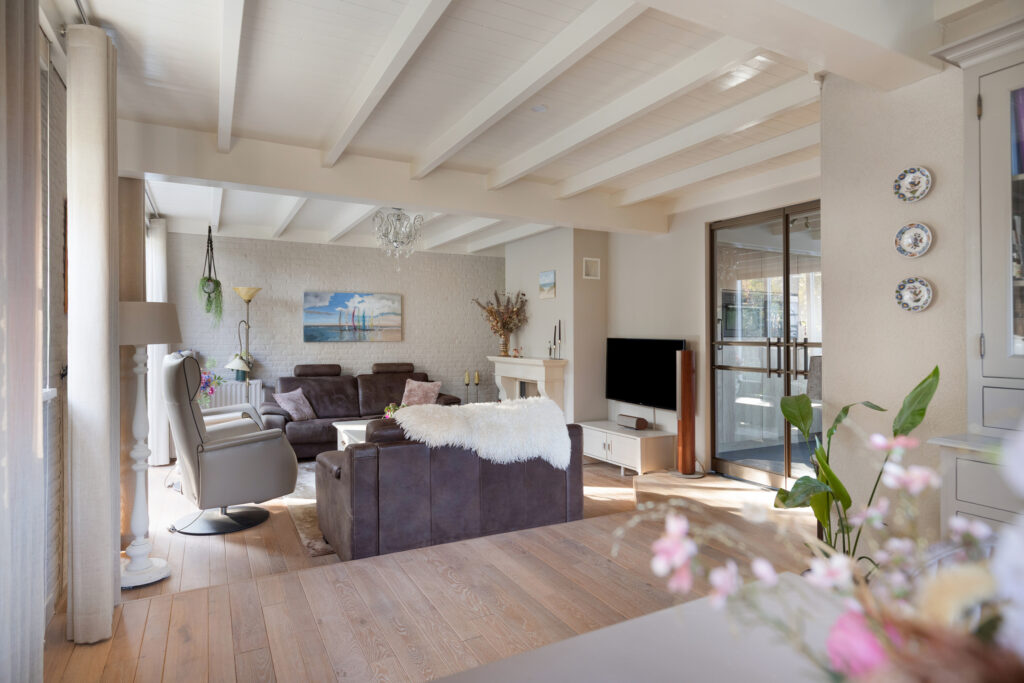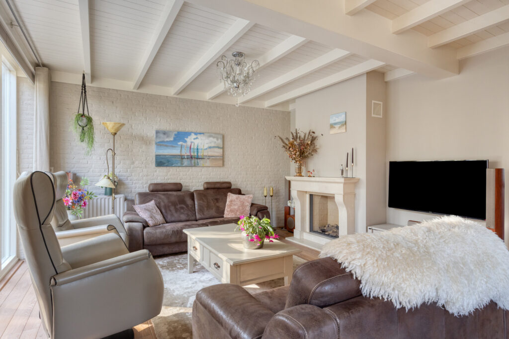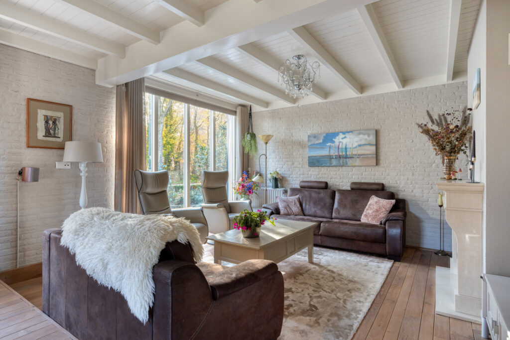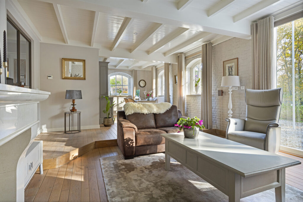 De woonkamer is afgewerkt met een houten balkenplafond, schoonmetselwerk en een prachtige eikenhouten vloer. Daarnaast zorgt een gashaard voor extra sfeer.