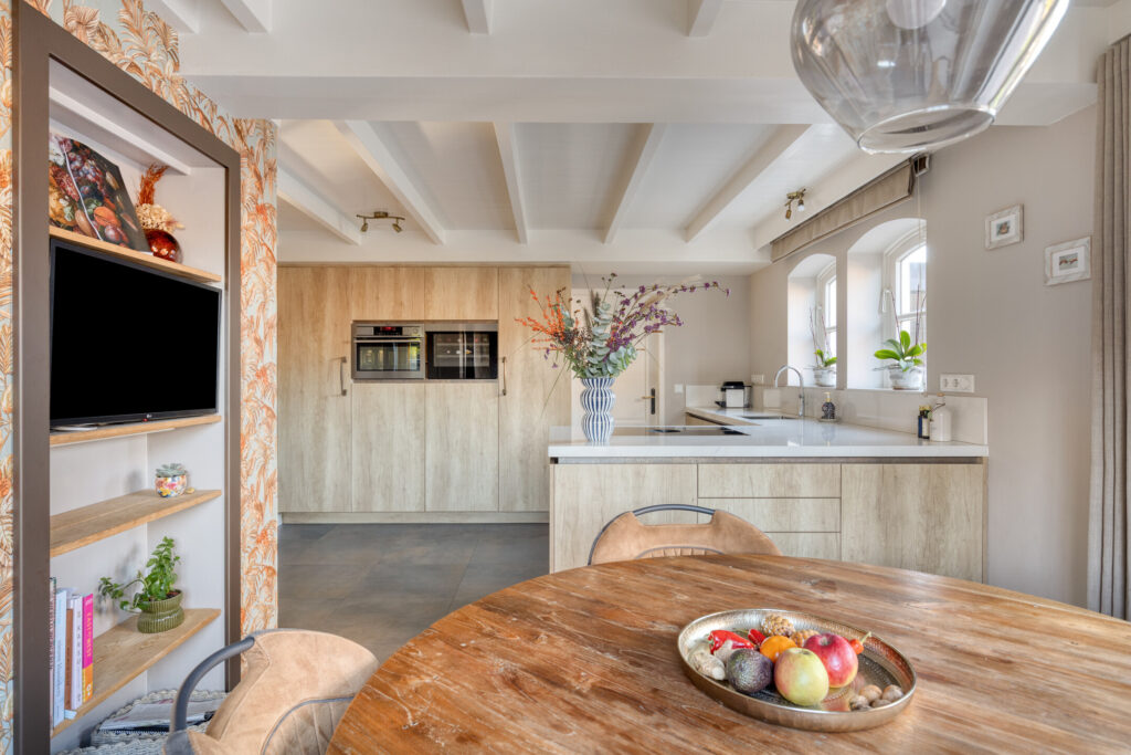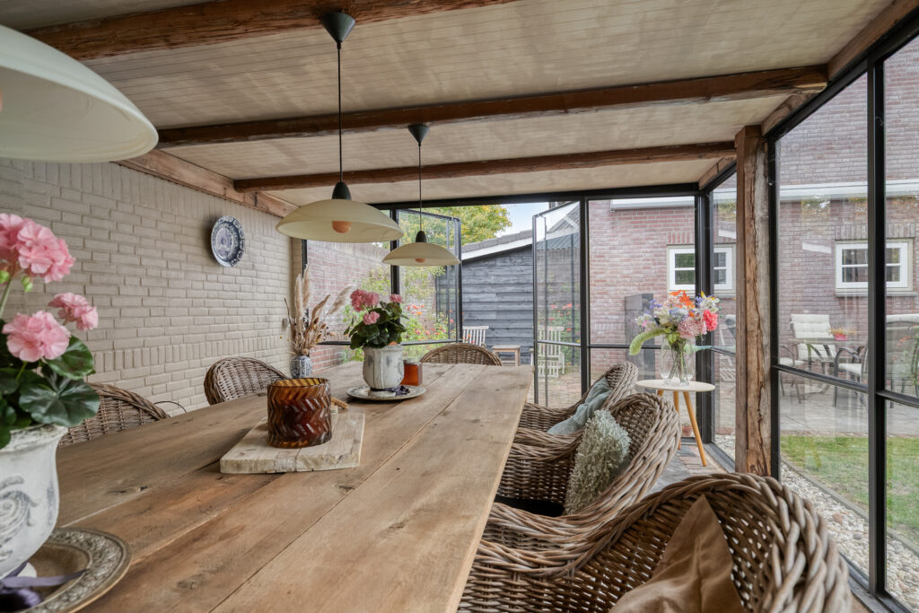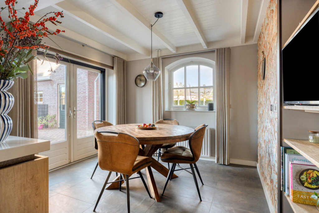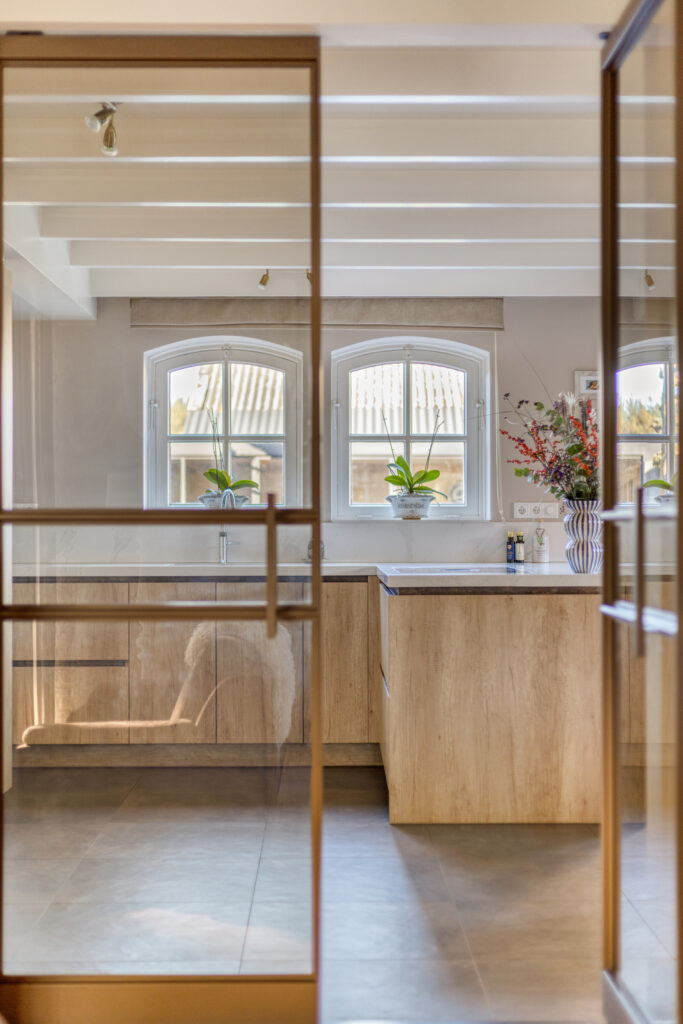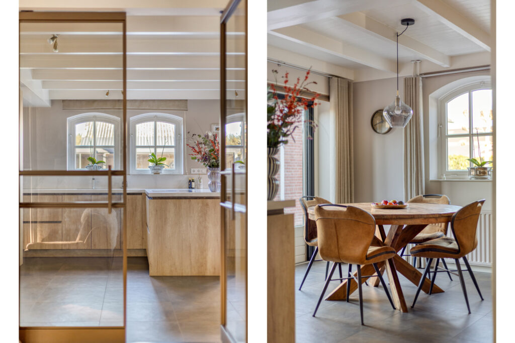 Een stijlvolle taatsdeur scheidt de keuken van de sfeervolle woonkamer. Karakteristieke boerderijramen en een groot raampartij zorgen voor veel natuurlijk licht.
