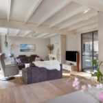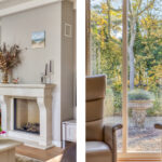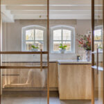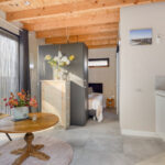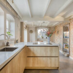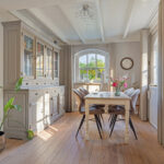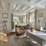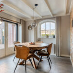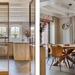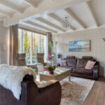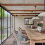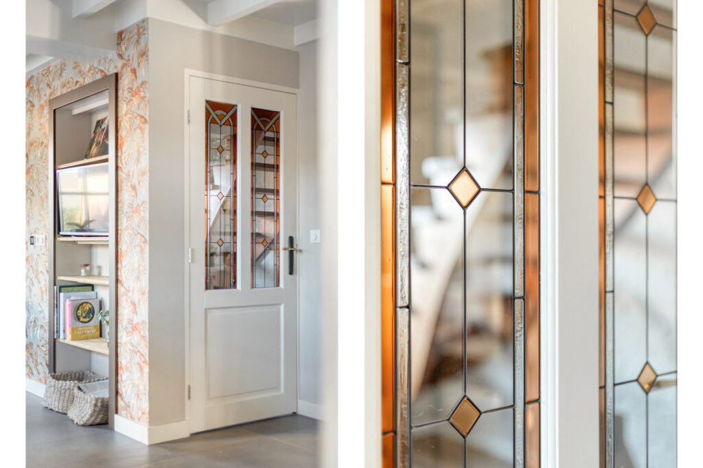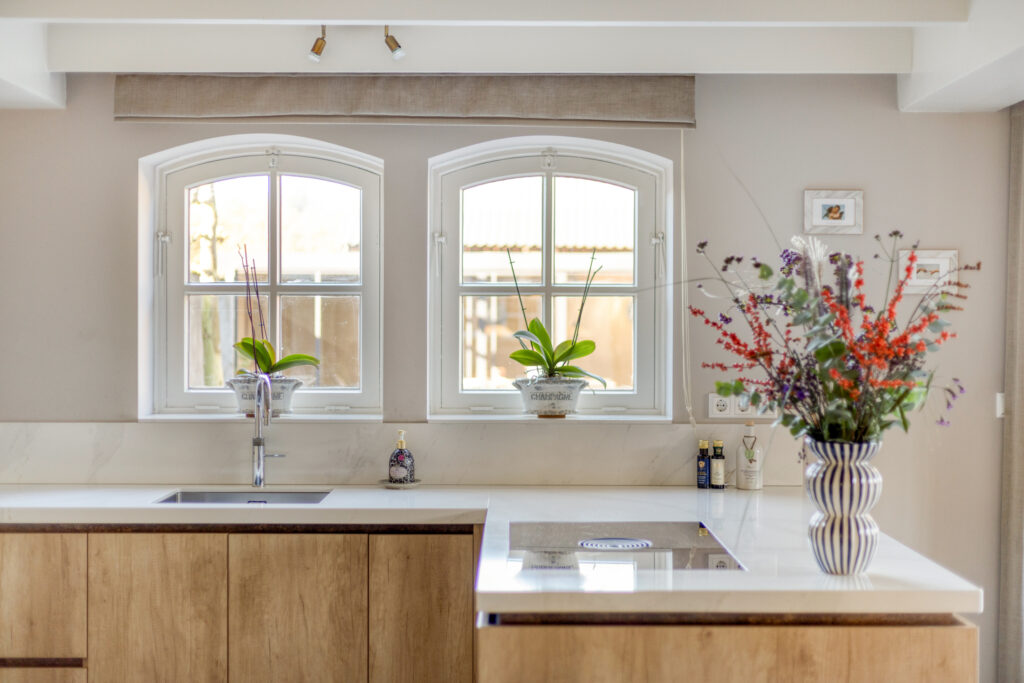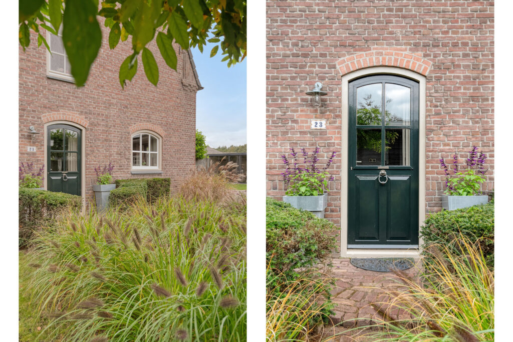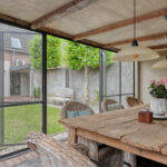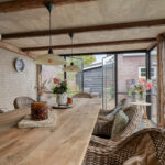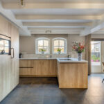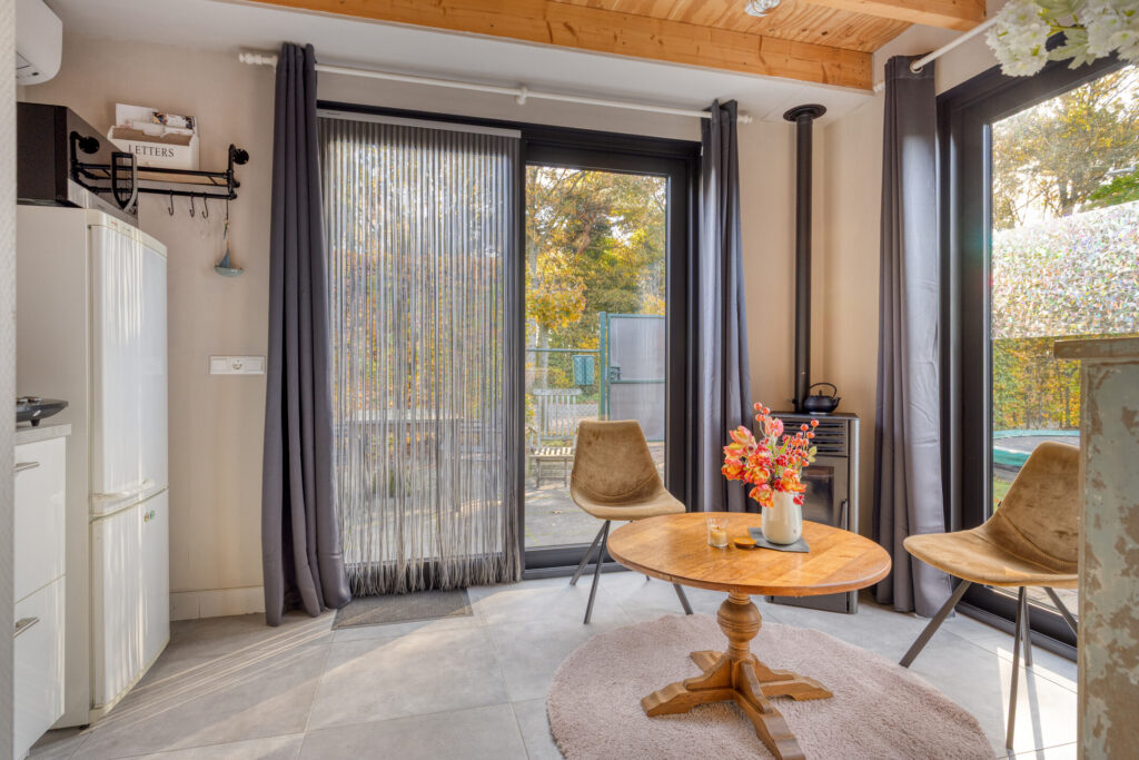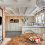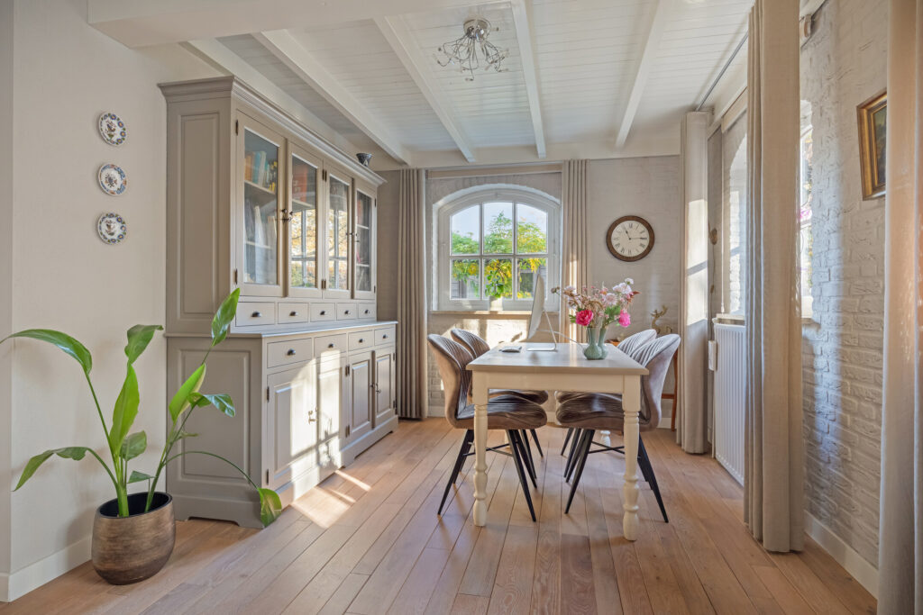 Een stijlvolle taatsdeur scheidt de keuken van de sfeervolle woonkamer. Karakteristieke boerderijramen en een groot raampartij zorgen voor veel natuurlijk licht.