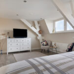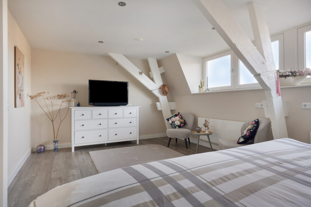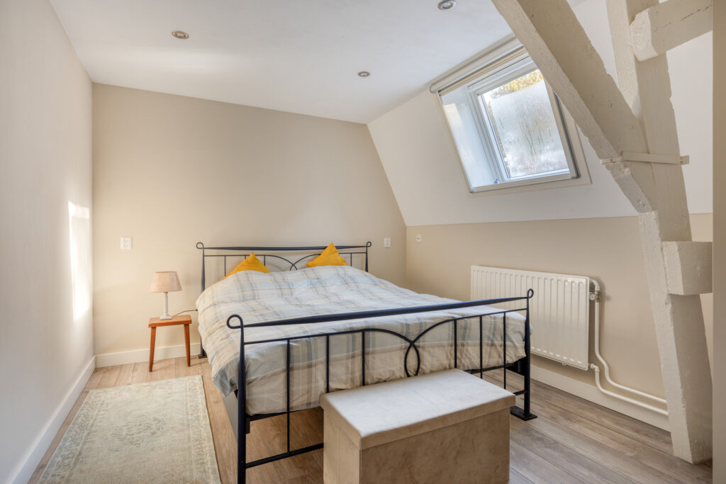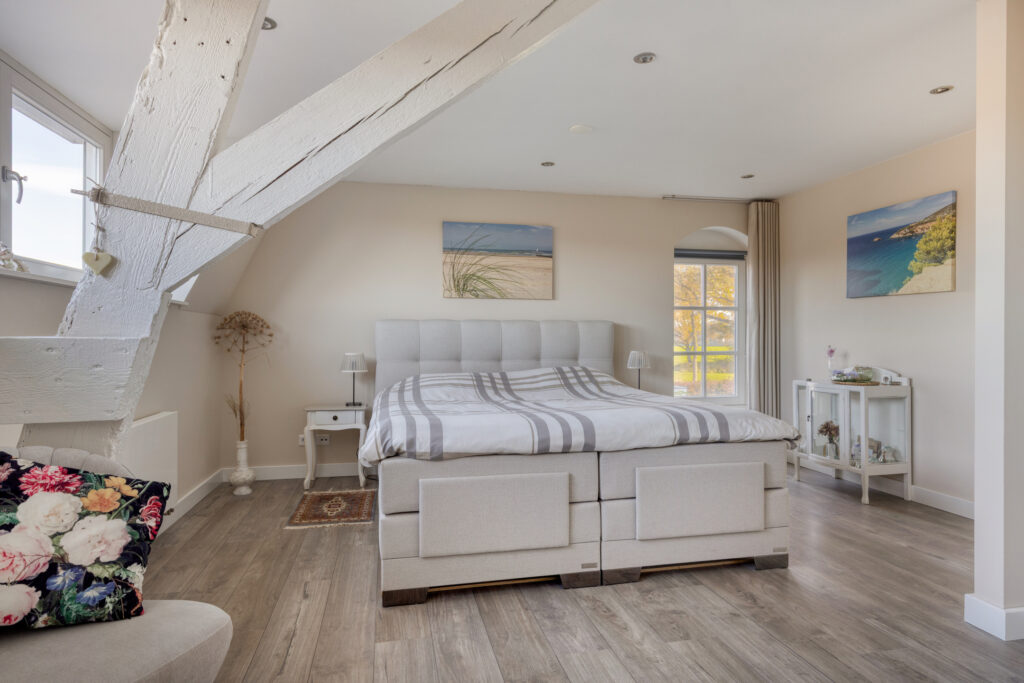 De zeer ruime ouderslaapkamer bevindt zich aan de achterzijde. In 2016 is de kleinste slaapkamer hierbij betrokken. De kamer is voorzien van een ruime dakkapel met elektrisch bedienbare rolluiken, stucwerk, laminaatvloer en een charmante houten balk. De overige twee slaapkamers liggen aan de voorzijde van de woonboerderij. De authentieke houten spanten zijn in het zicht en laten het karakter van de woning zien.