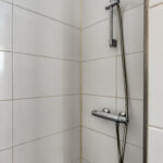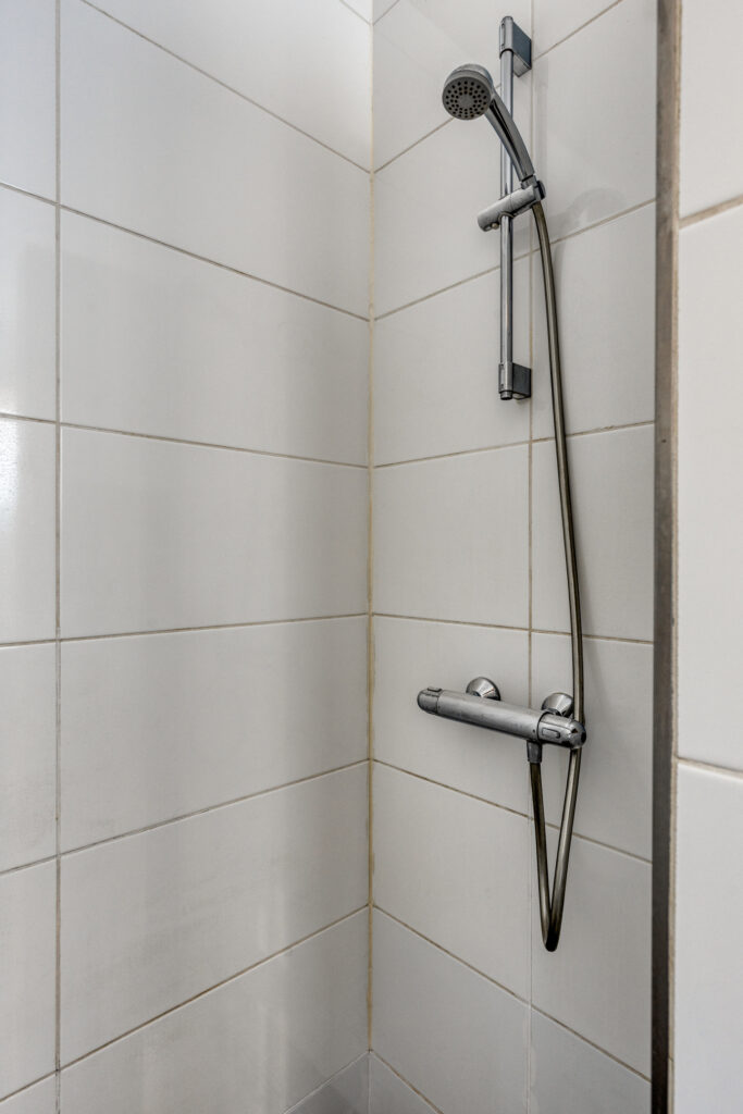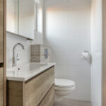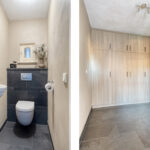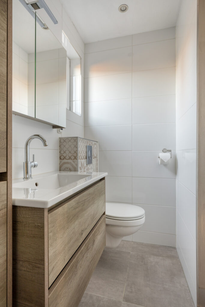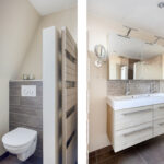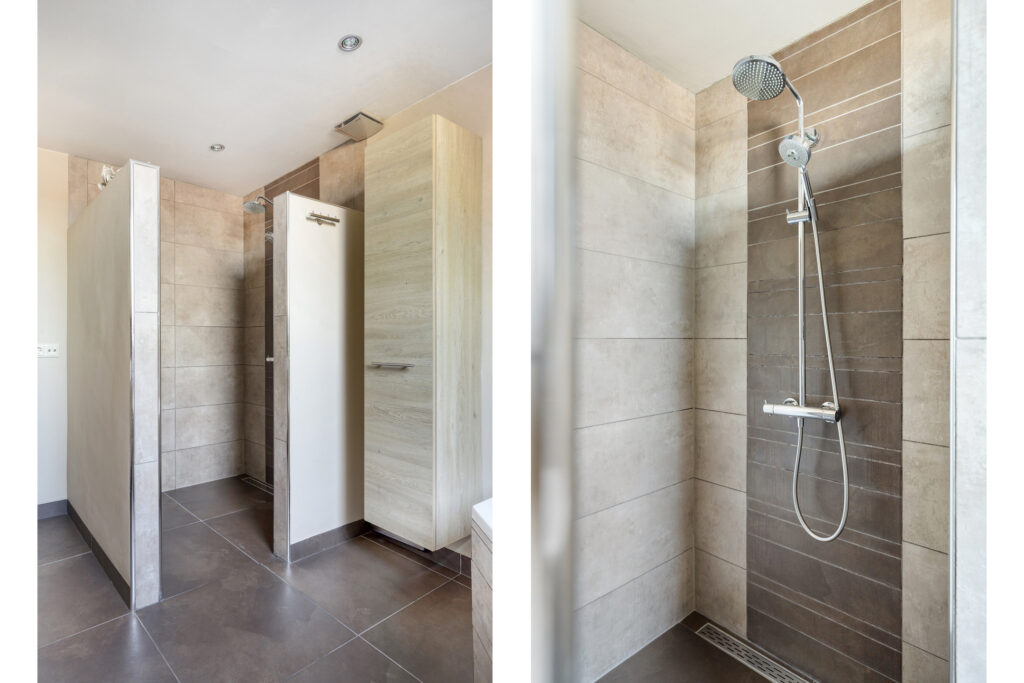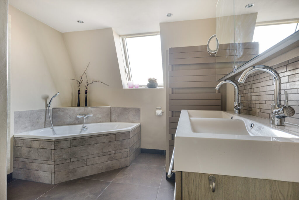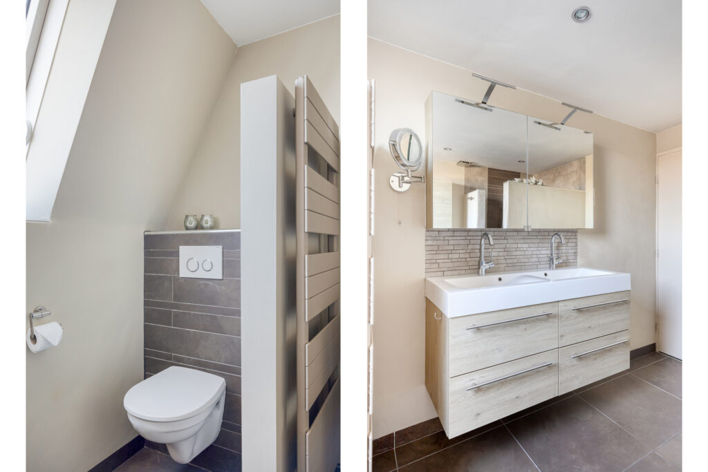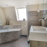De ruime badkamer is uitgerust met een ligbad, inloopdouche met regen- en handdouche, zwevend toilet, dubbele wastafel met badmeubel en elektrische vloerverwarming. Naast de mechanische ventilatie zorgt een dakraam voor de natuurlijke ventilatie.