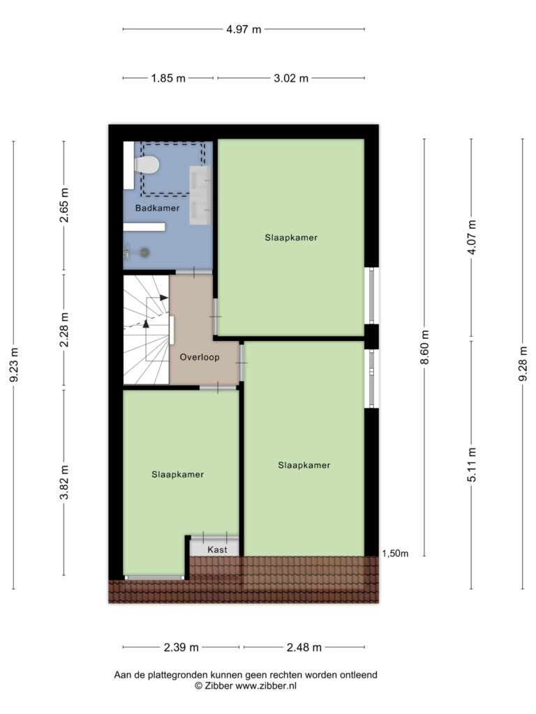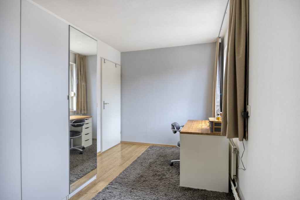 Op deze verdieping zijn 3 volwaardige slaapkamers, allen voorzien van een laminaatvloer en rolluiken. De moderne badkamer is geheel betegeld en voorzien van een inloopdouche, wandcloset, dubbele wastafel, spiegelkast met verlichting, kolomkast en design radiator. Het dakraam zorgt voor natuurlijk lichtinval.
