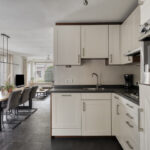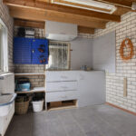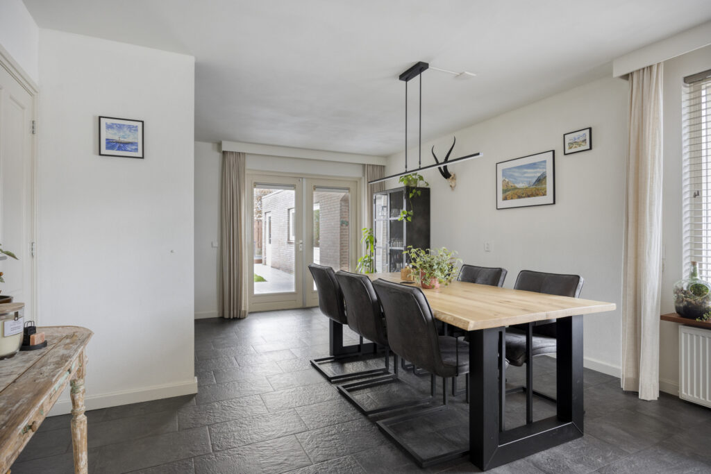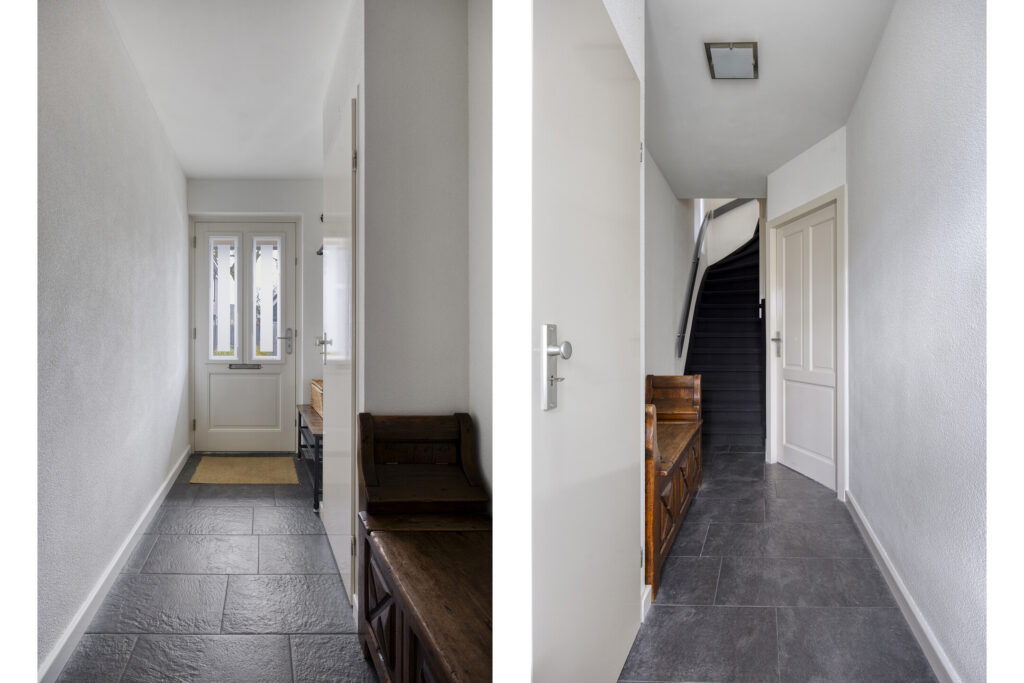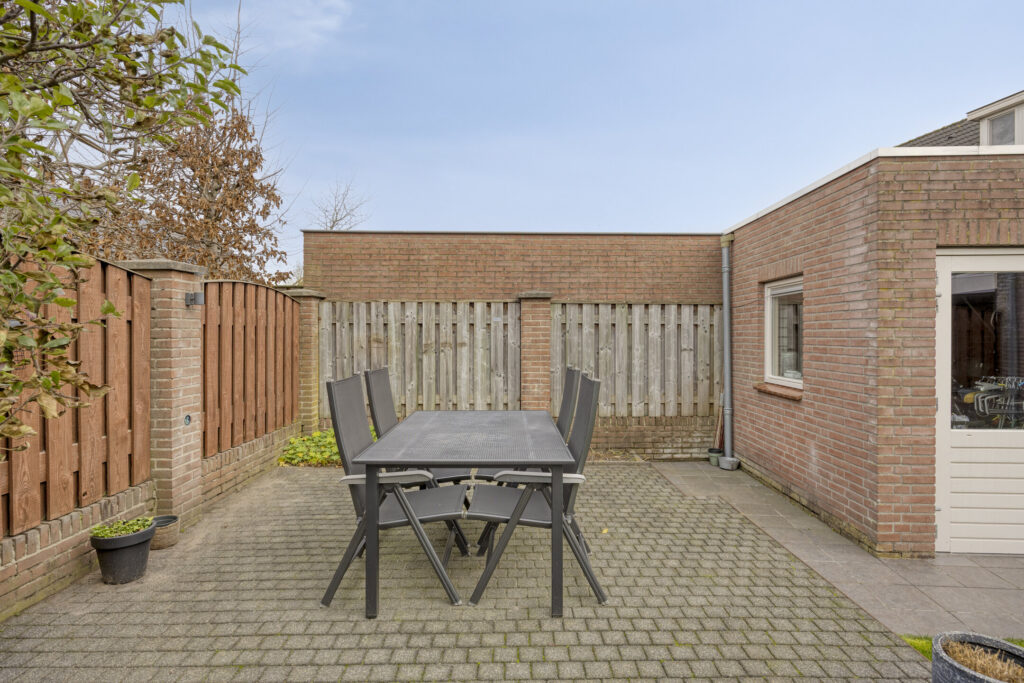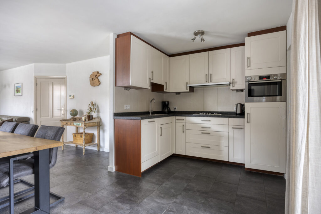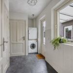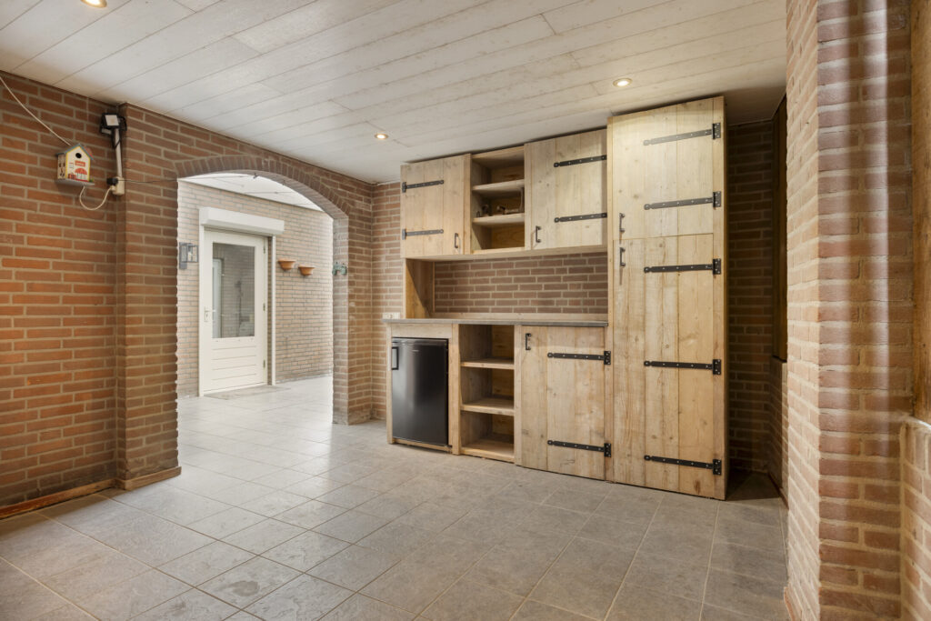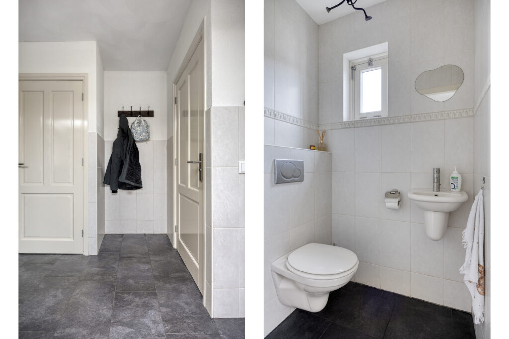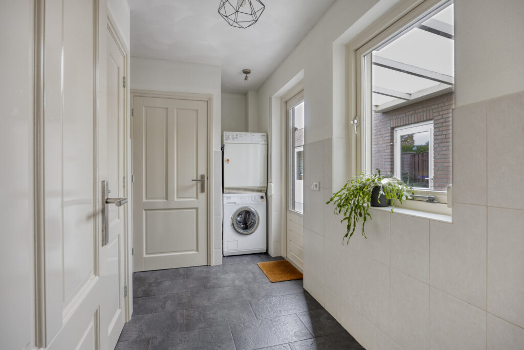 Vanuit de keuken is er toegang tot de aangebouwde bijkeuken. Hier vind je een kast met de opstelling van de cv-combiketel, een vaste kast, de toiletruimte en de aansluitingen voor de wasapparatuur. De toiletruimte is geheel betegeld in een neutrale kleurstelling en voorzien van een wandcloset en fonteintje.