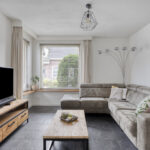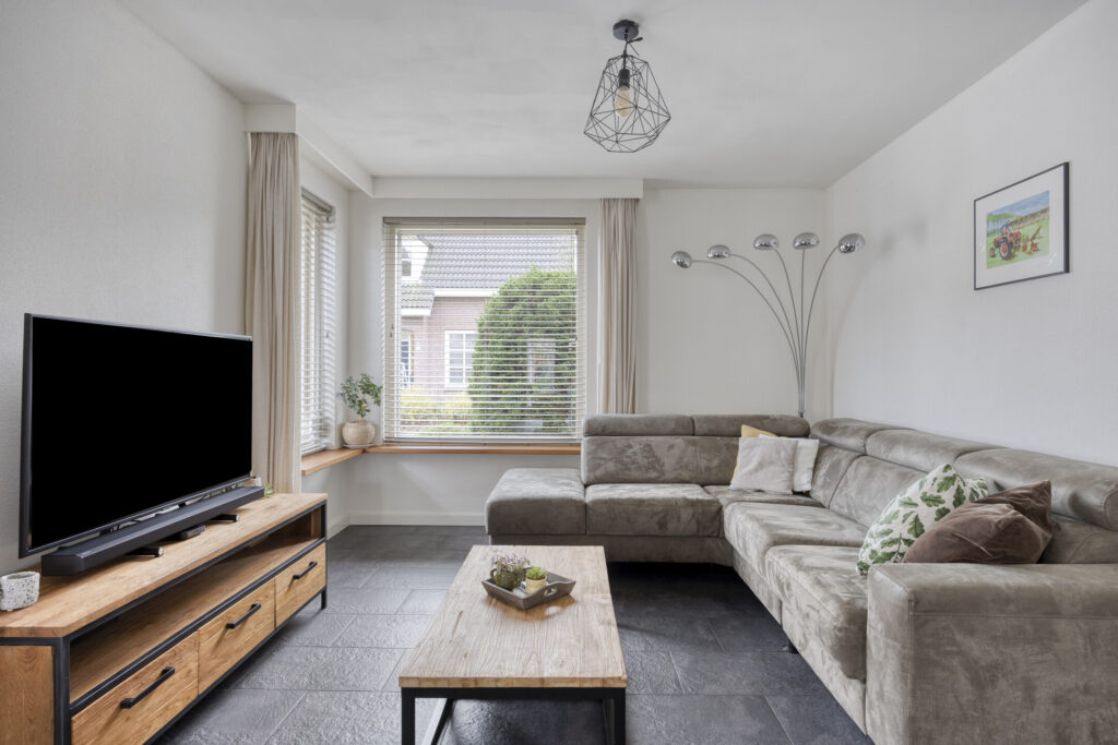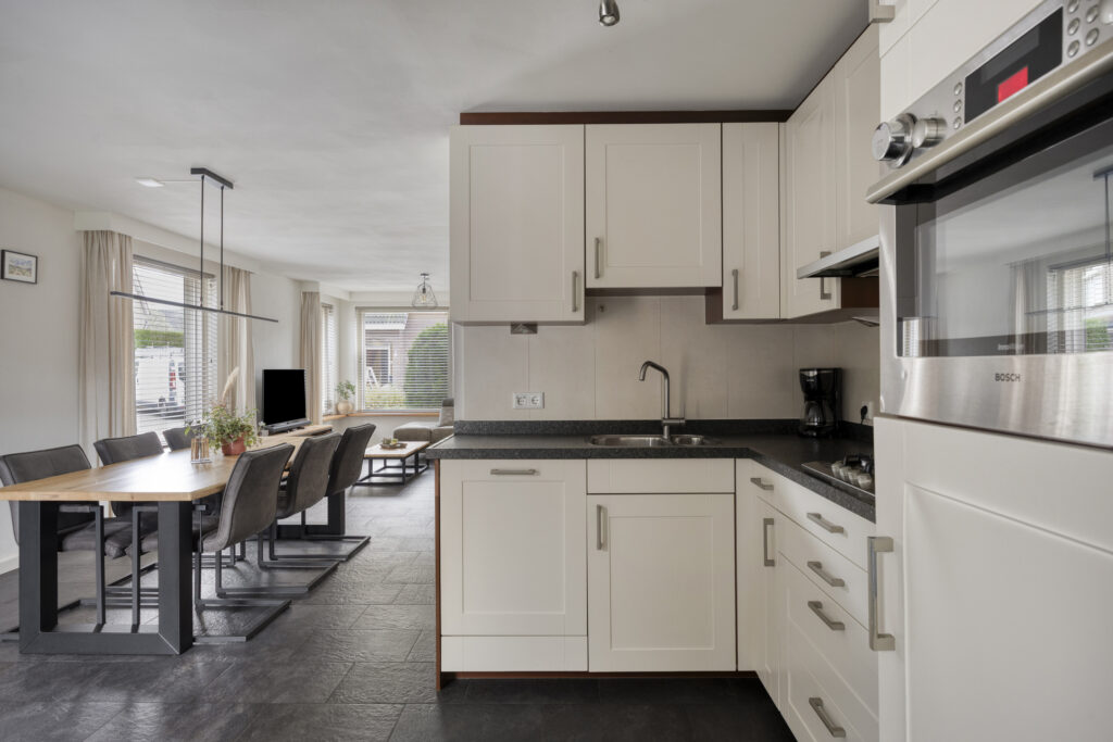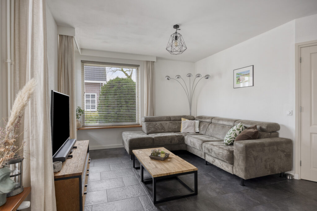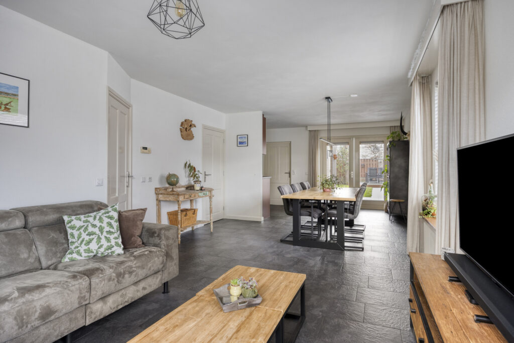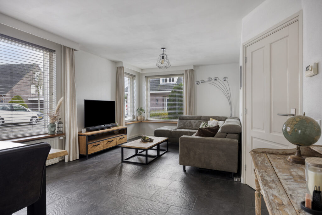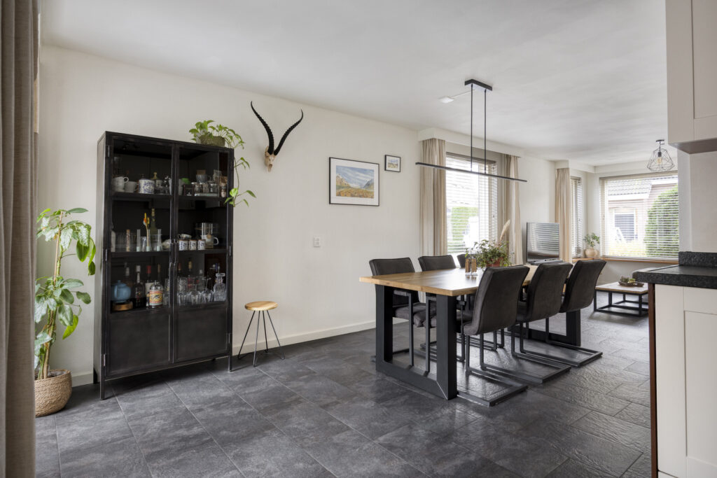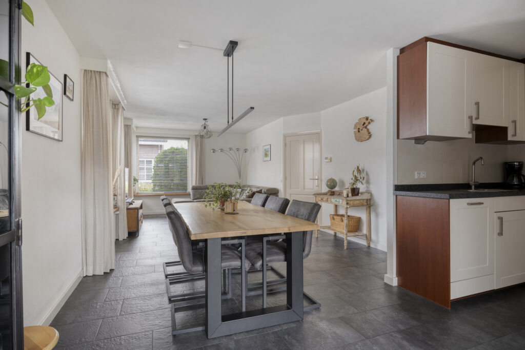 De auto parkeer je op de eigen oprit. Via de voordeur kom je in de hal met de garderobe, meterkast en trapopgang naar de eerste verdieping. De ruime woonkamer heeft aan de voorzijde de zithoek en aan de achterzijde de eethoek. De diverse ramen zorgen voor veel lichtinval. De wanden zijn voorzien van spachtelputz en er ligt een neutrale tegelvloer welke voorzien is van vloerverwarming. De open keuken is voorzien van een hoekopstelling met diverse kasten en is voorzien van de volgende inbouwapparatuur: 4-pits gaskookplaat, afzuigkap, koelkast, combi-magnetron en vaatwassser.