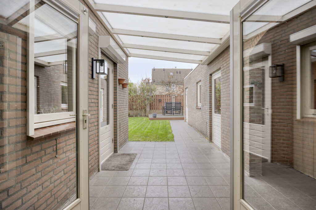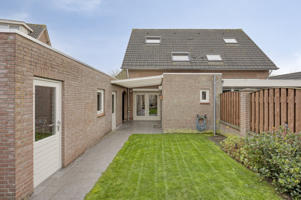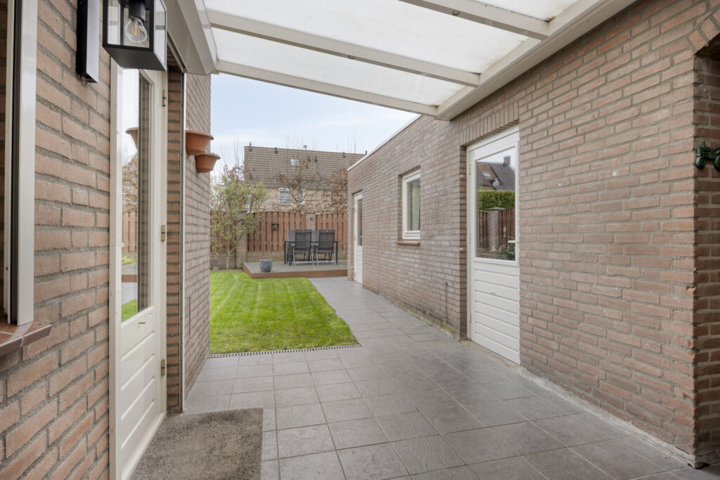 Direct aan de woning is een overkapping gelegen, waardoor je altijd droog naar de afsluitbare carport en berging kan lopen. De berging, in spouw opgetrokken, is opgedeeld in 2 delen. Beide voorzien van elektra, verwarming en in 1 van de bergingen is water aanwezig.