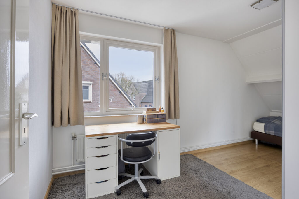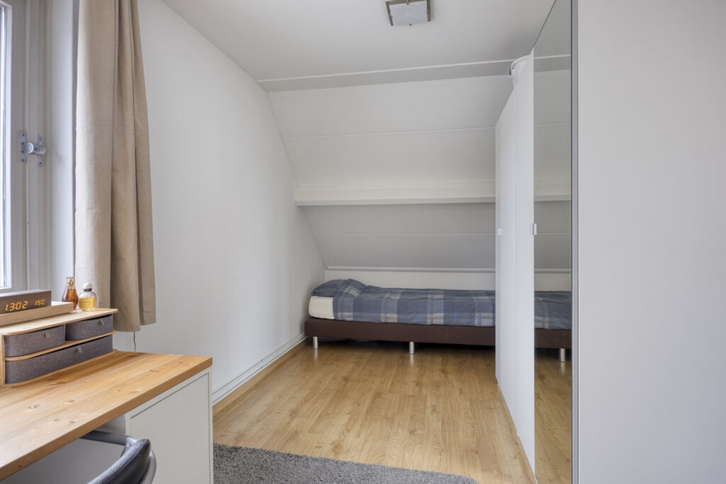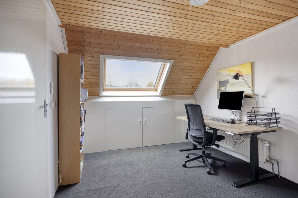 Een vaste trap brengt je naar de ruime voorzolder met een berging en een luik naar de bergzolder in de punt van het dak. De ruime zolderkamer, voorzien van een groot dakvenster, is uitstekend geschikt als vierde volwaardige slaapkamer.
