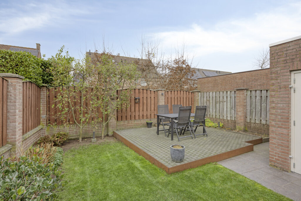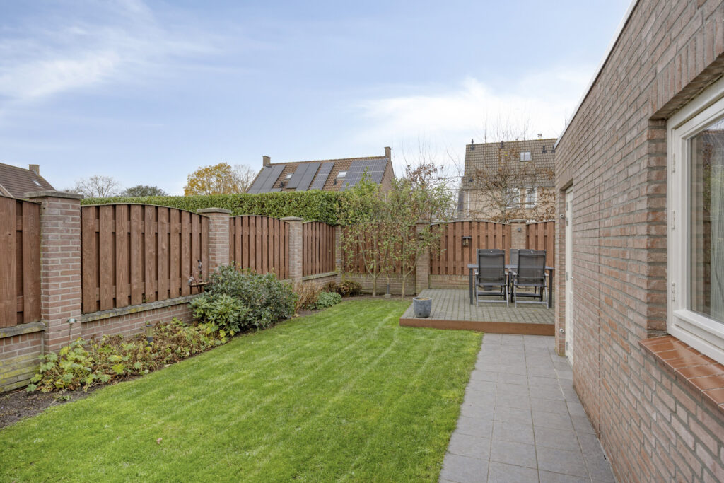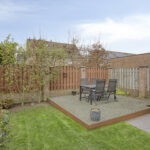 De tuin is aangelegd met een terras aan de achterzijde, een gazon en een vaste plantenborder.