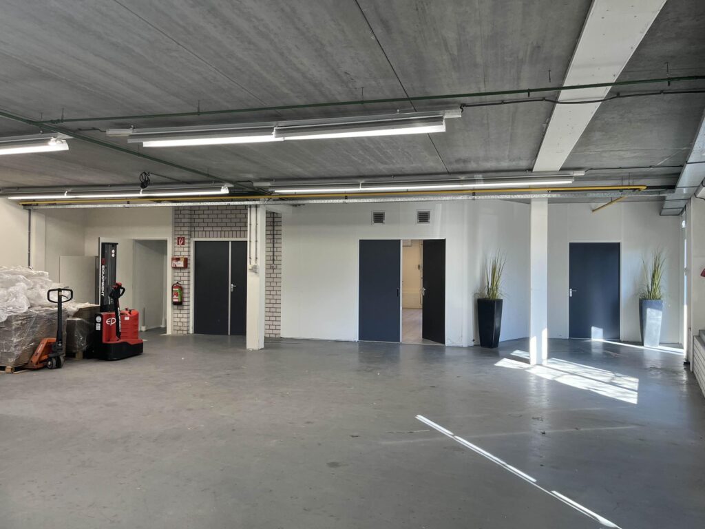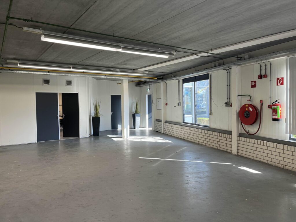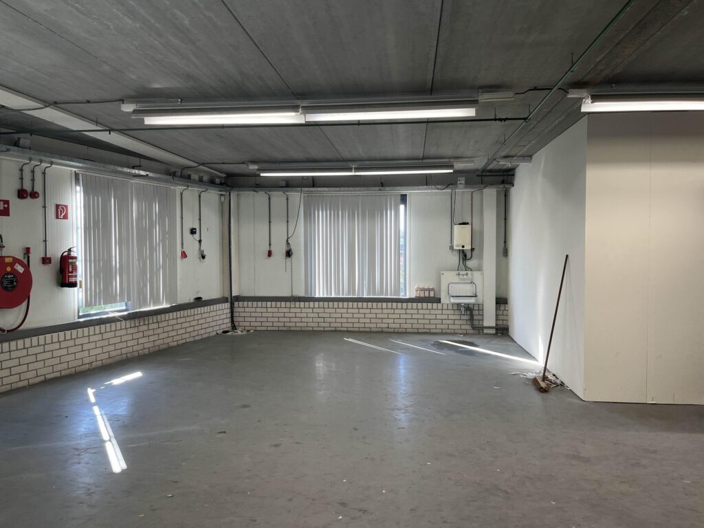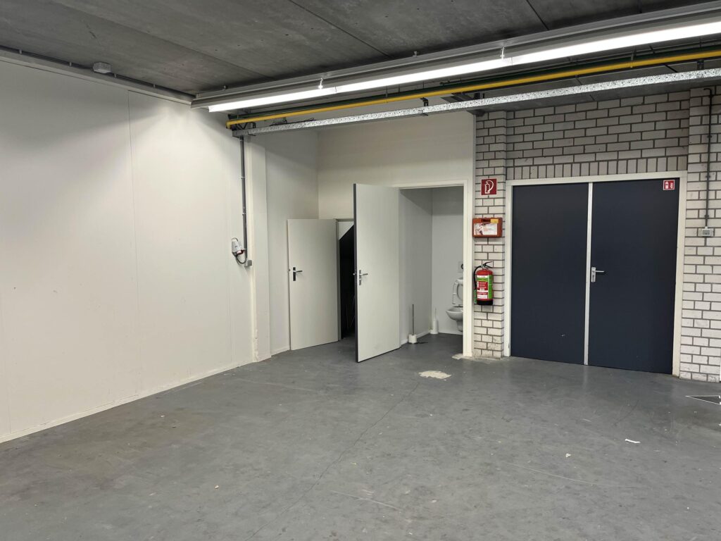 De bedrijfshal (totaal circa 170 m2) beschikbaar via de zijingang van het pand wat volledig een betonnen vloer heeft. Waarbij je ook nog 2 opbergruimtes hebt ter beschikking. Daarbij aansluitend zit de ruime Kantoorruimte met volop licht inval wat dan ook volledig verwarmd is met radiatoren.