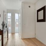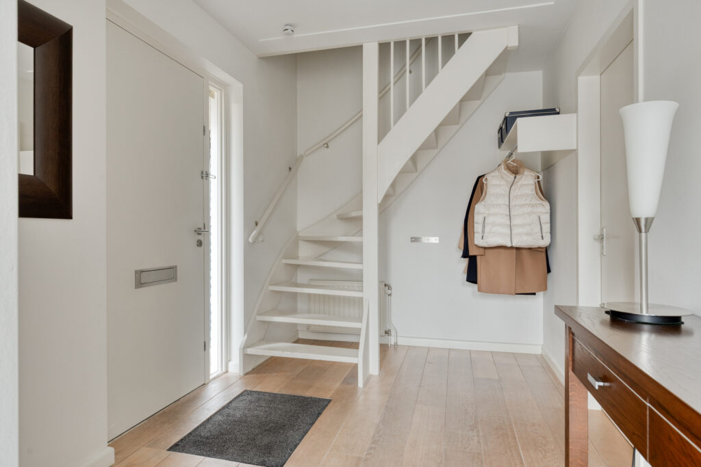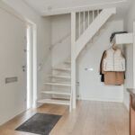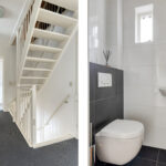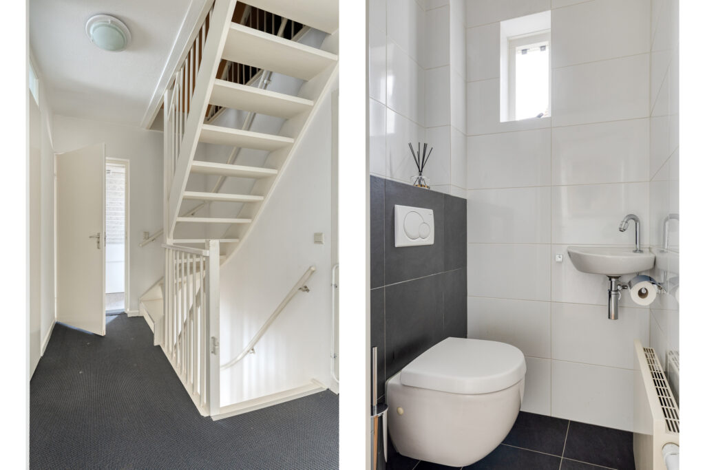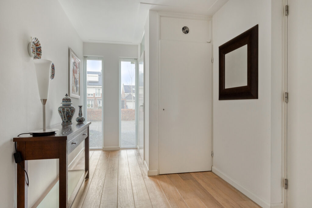 In de royale entree bevindt zich het volledig betegelde toilet, uitgevoerd in neutrale tinten en voorzien van een fonteintje en een zwevend closet. Daarnaast is in de hal de meterkast gesitueerd en is er voldoende ruimte voor een garderobe.