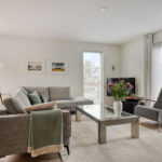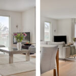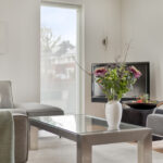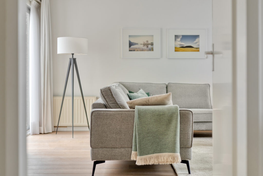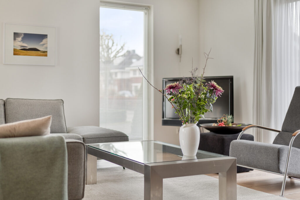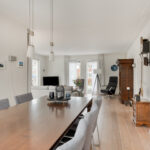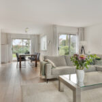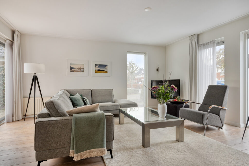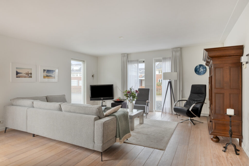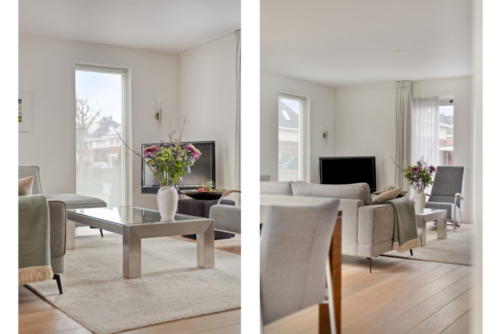 De woonkamer heeft een ruime living en geniet van volop daglicht dankzij de grote raampartijen en de schuifpuien aan de achterzijde. De eikenhouten vloer en de strak afgewerkte wanden en plafonds zorgen voor een verzorgd geheel.