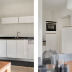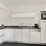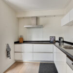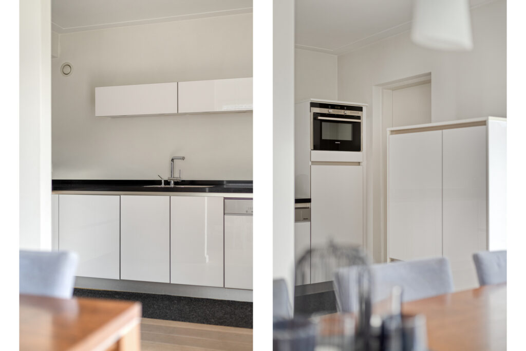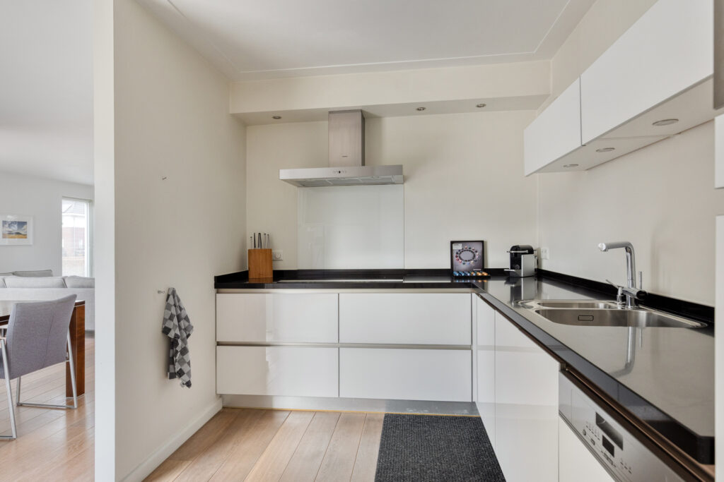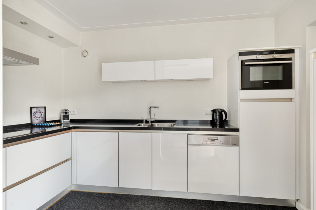 De keuken is uitgevoerd in hoogglans wit en voorzien van een composieten werkblad. De inbouwapparatuur bestaat uit een 5-pits inductiekookplaat, vriezer, combi-oven en een vaatwasser. Dankzij de diverse kasten is er volop bergruimte beschikbaar.