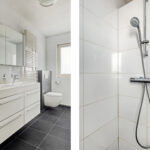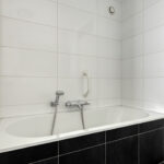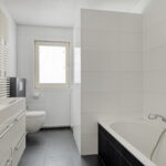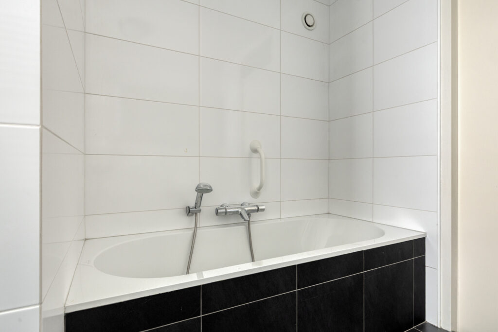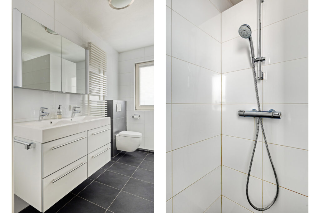 De badkamer is keurig onderhouden en uitgevoerd in neutrale tinten. De ruimte is voorzien van een ligbad, inloopdouche, toilet en dubbele wastafel met badkamermeubel.