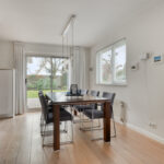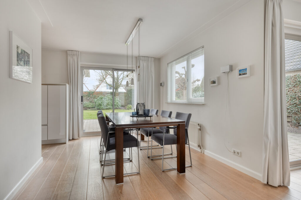 De eethoek is aan de achterzijde van de woonkamer gesitueerd, met zicht op de tuin, en staat in open verbinding met de keuken.