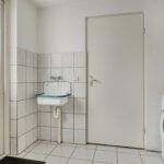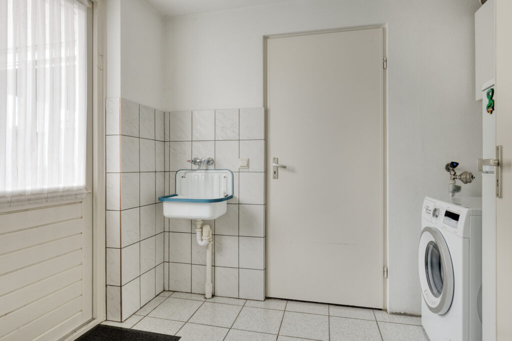 Vanuit de keuken bereikt u de bijkeuken, waar de witgoedaansluitingen en een uitstortgootsteen zijn gesitueerd. Vanuit de bijkeuken heeft u toegang tot zowel de inpandige berging als de achtertuin.