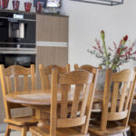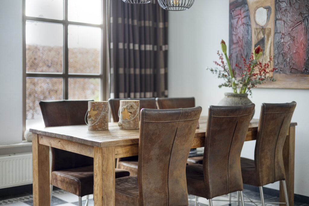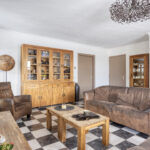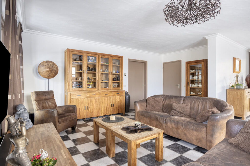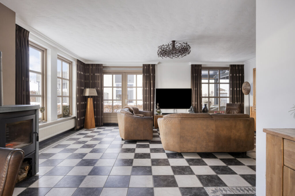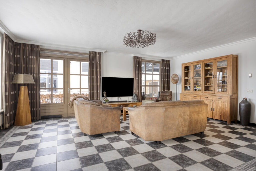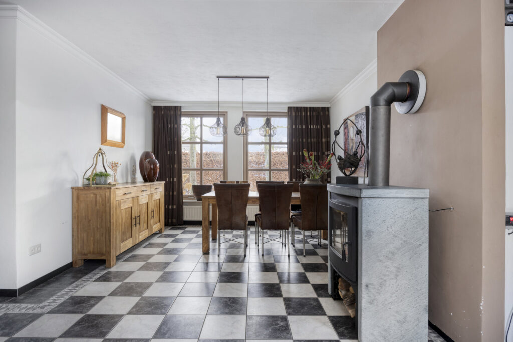 De ruime living is voorzien van een tegelvloer met vloerverwarming, een houtkachel, en stucwerk wanden en plafonds. Er is volop ruimte voor zowel een gezellige zithoek als een eethoek. Dubbel openslaande deuren geven toegang tot de achtertuin.