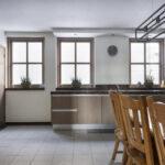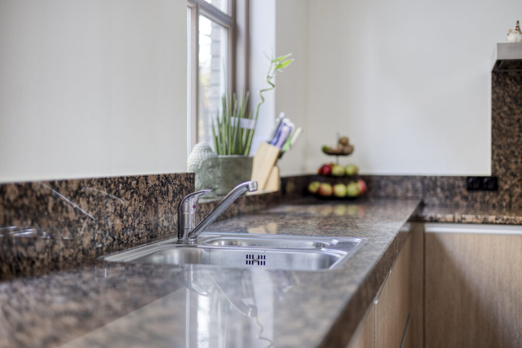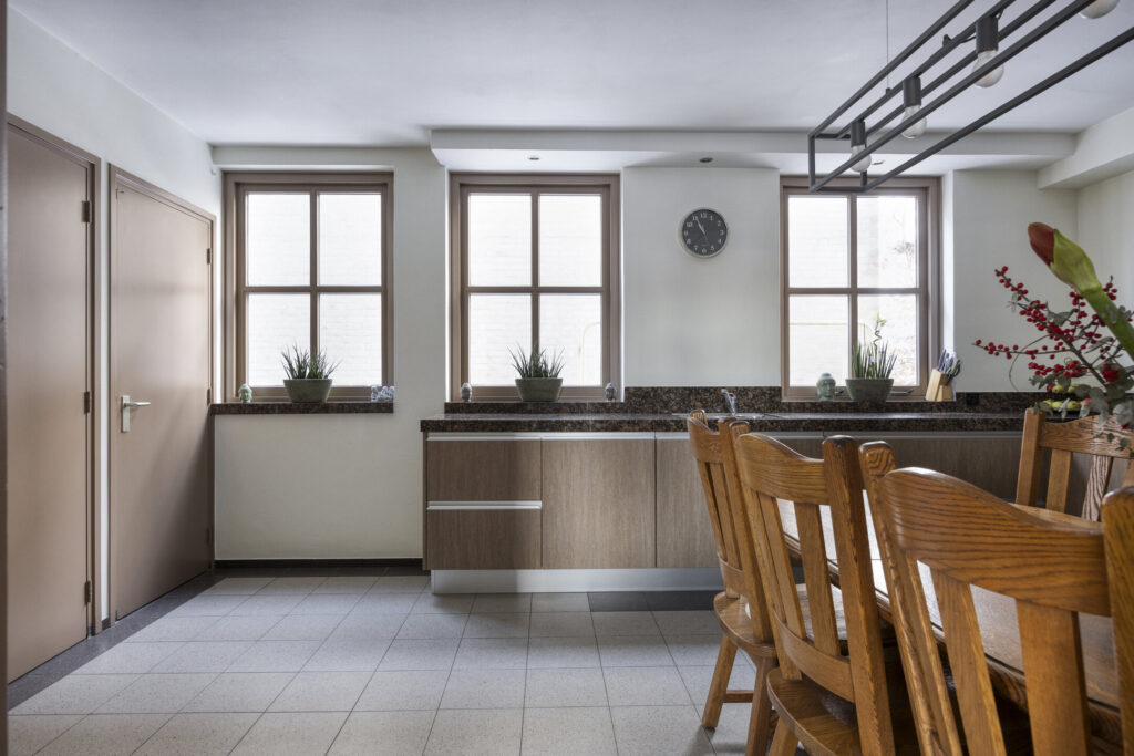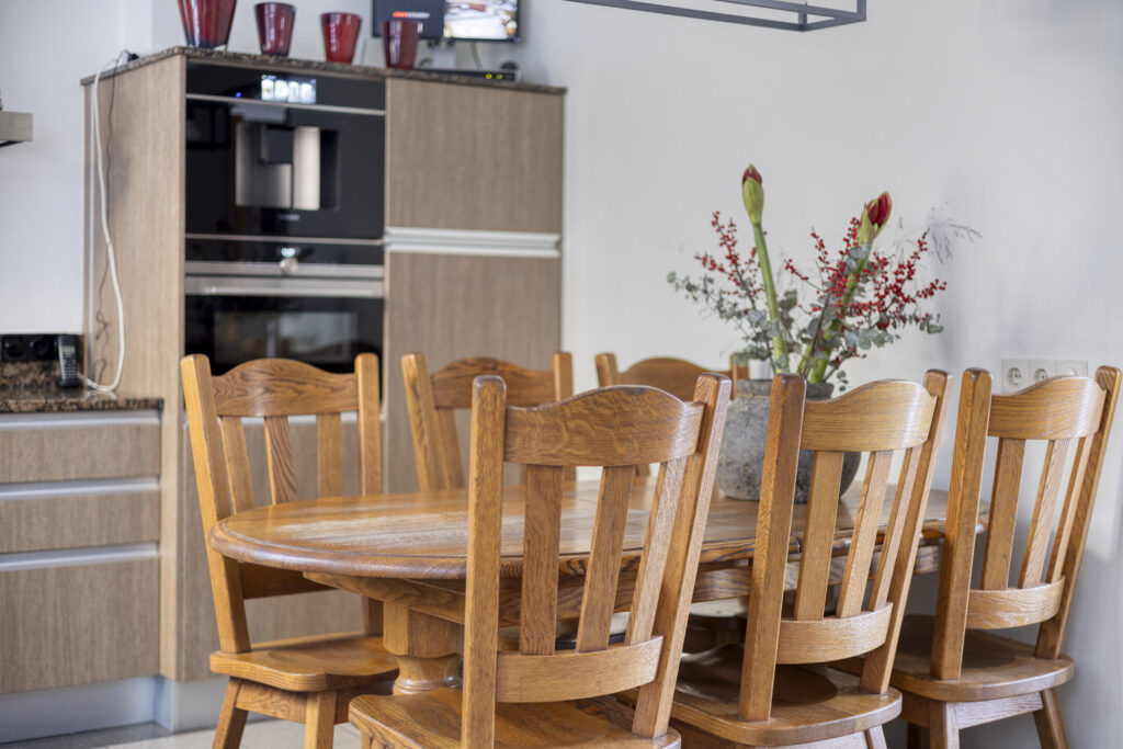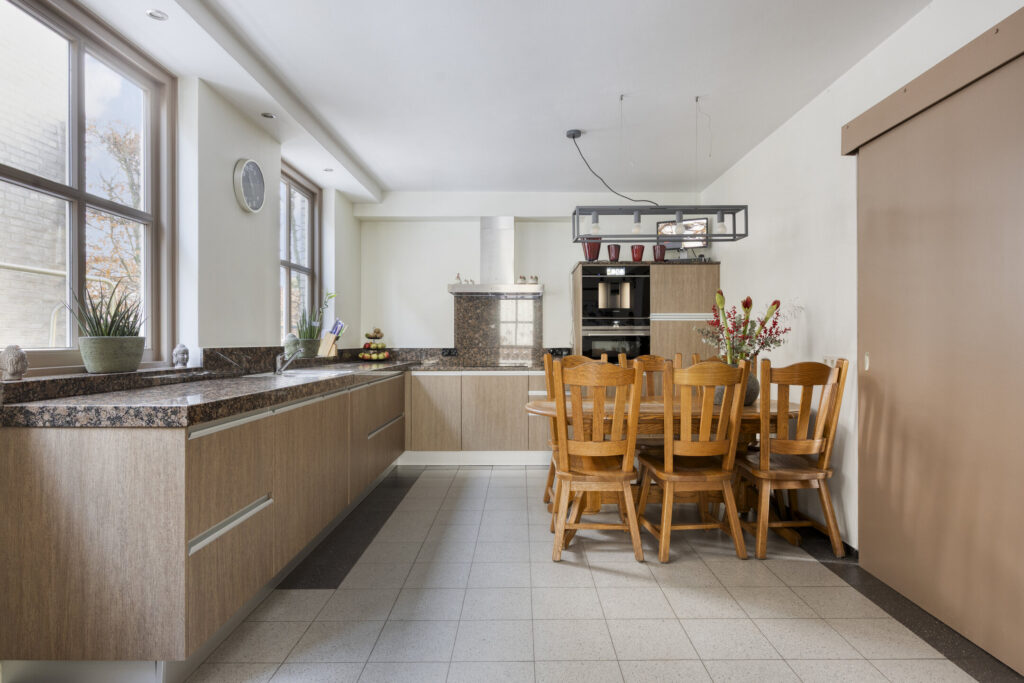 De dichte keuken is uitgerust met een natuurstenen werkblad, 4-pits inductiekookplaat, koel-/vriescombinatie en combimagnetron. Vanuit de keuken is de kelder bereikbaar, evenals de bijkeuken met diverse technische installaties, waaronder een elektrische boiler en aansluitingen voor witgoed.