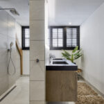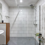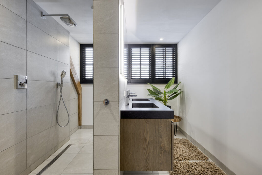 De badkamer is recent vernieuwd (2023) en uitgerust met een dubbele wastafel met badmeubel en een zeer ruime inloopdouche met regen- en handdouche. In de badkamer is mechanische ventilatie aanwezig en daarnaast vloerverwarming. Het separaat toilet is in dezelfde stijl afgewerkt.