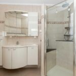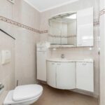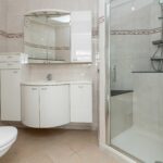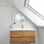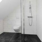 De moderne badkamer is afgewerkt in neutrale tinten en beschikt over een ruime inloopdouche, een wastafel in een badmeubel en een toilet. Ook hier zorgt een groot dakvenster voor volop daglicht.