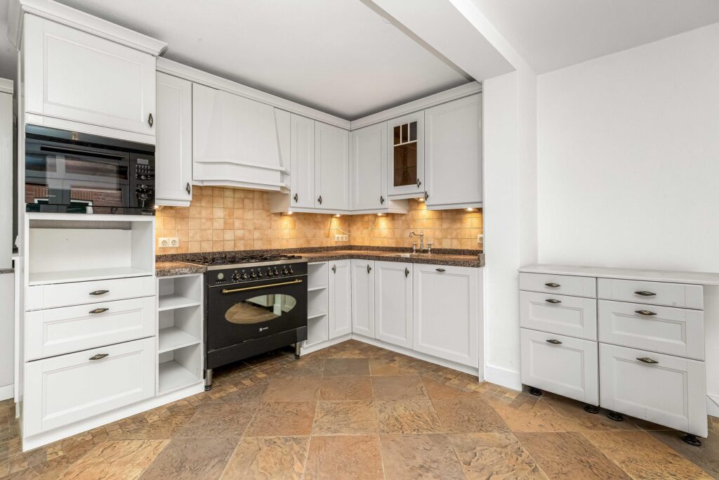 De ruime keuken is gesitueerd aan de achterzijde van de woning en biedt voldoende ruimte voor het plaatsen van een grote eettafel. De keuken is uitgerust met een granieten werkblad, een 6-pits gasfornuis met oven, een vaatwasser en een magnetron.