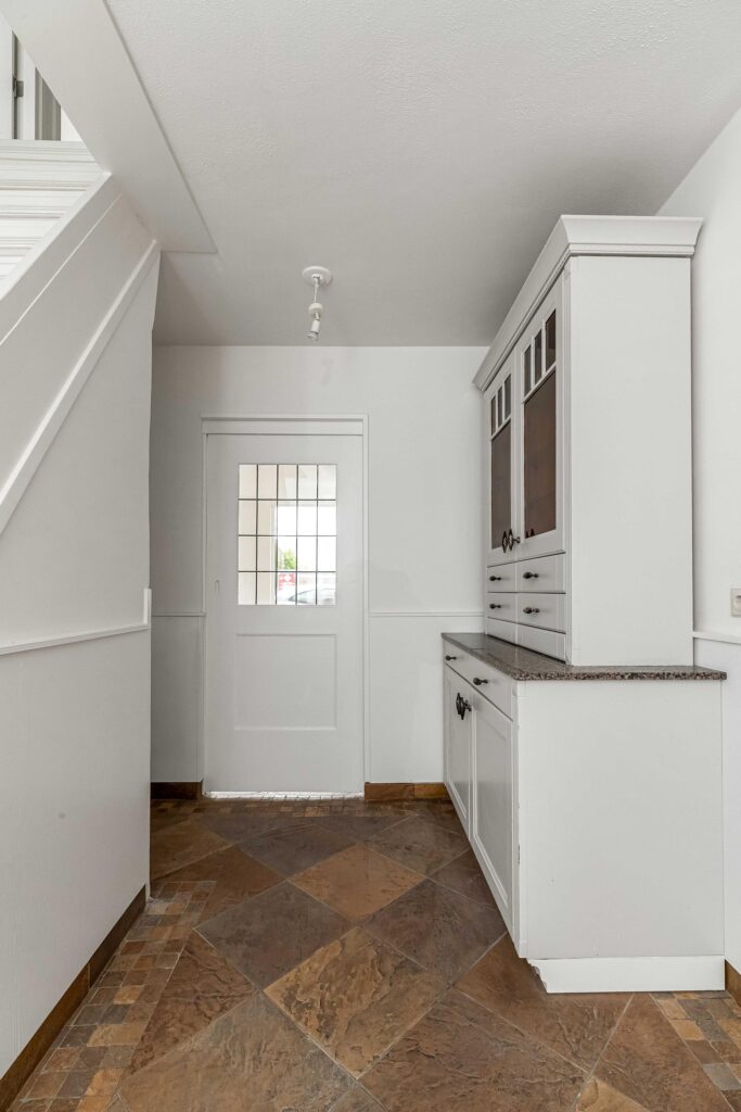 Via de achterdeur kom je binnen in de bijkeuken. Hier bevinden zich het gemoderniseerde toilet, de meterkast en een bergkast met daarin de cv-installatie.