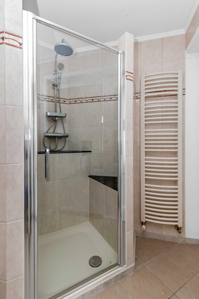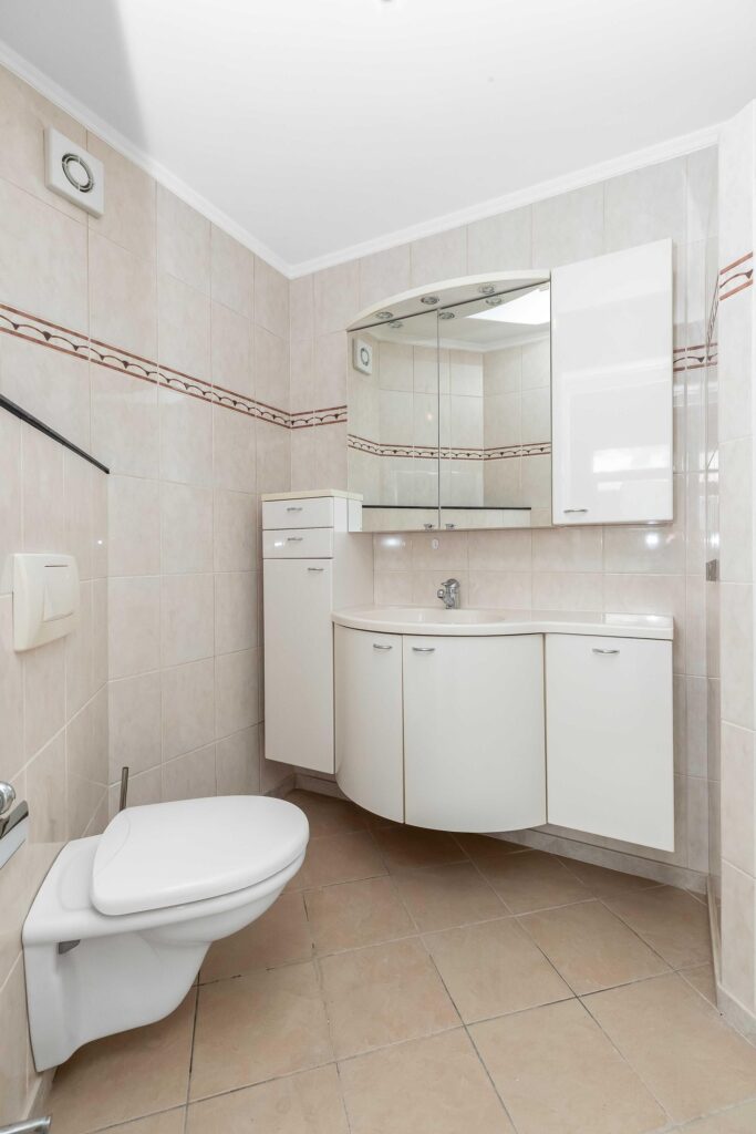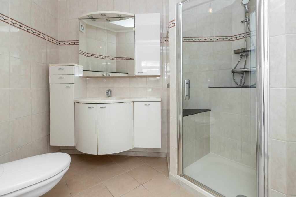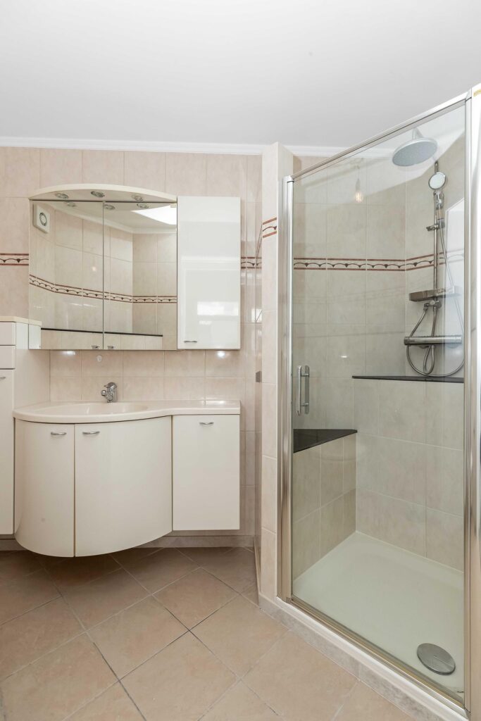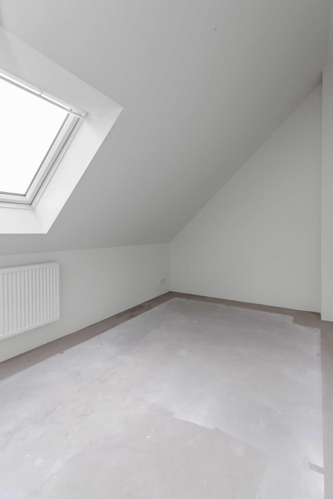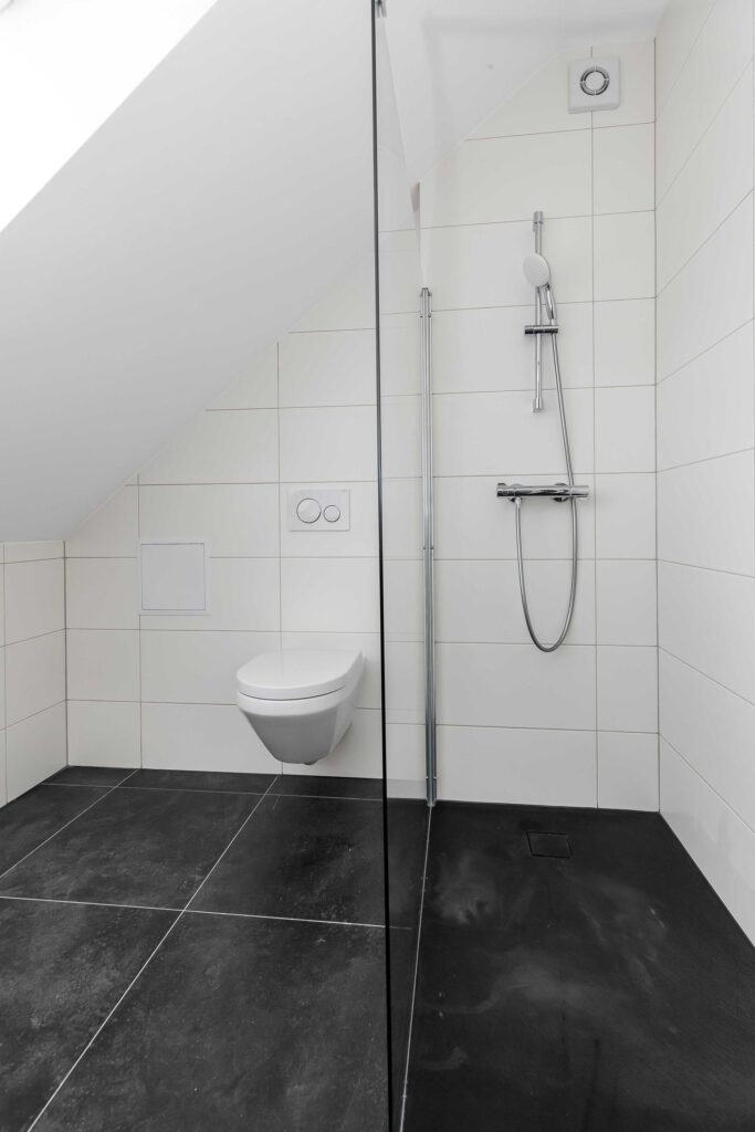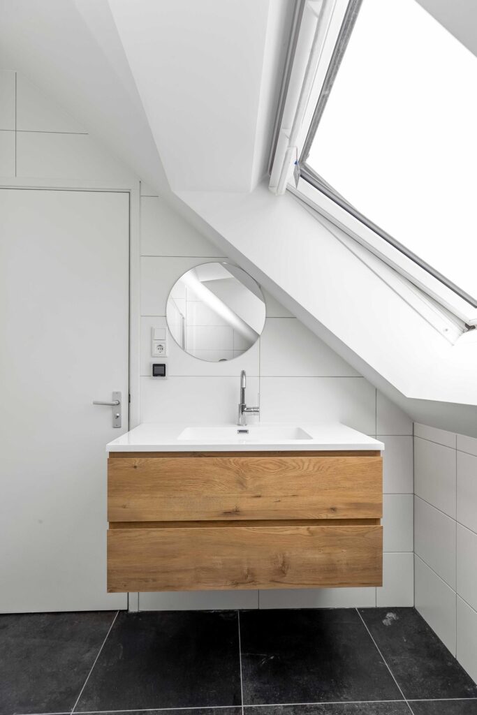 De moderne badkamer is afgewerkt in neutrale tinten en beschikt over een ruime inloopdouche, een wastafel in een badmeubel en een toilet. Ook hier zorgt een groot dakvenster voor volop daglicht.