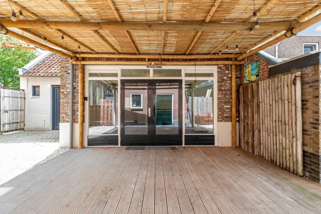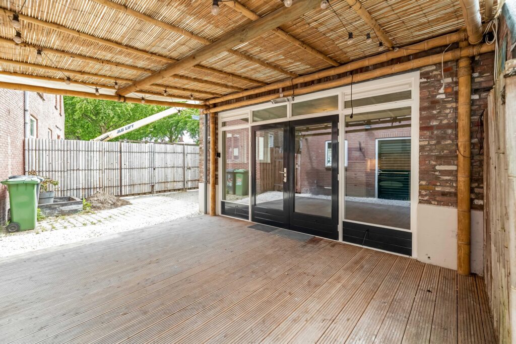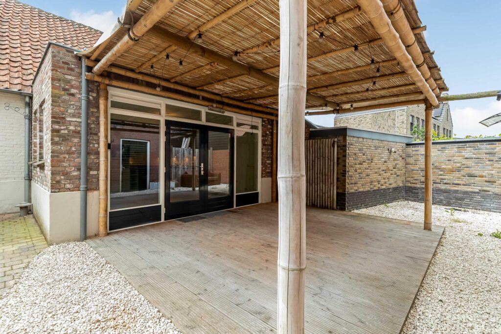 De onderhoudsvriendelijke achtertuin ligt op het noordwesten en is voorzien van een overkapping met een houten vlonderterras.