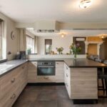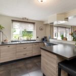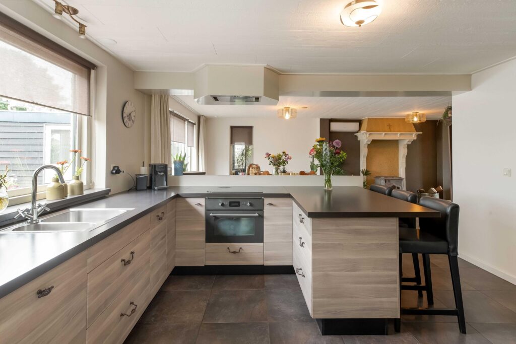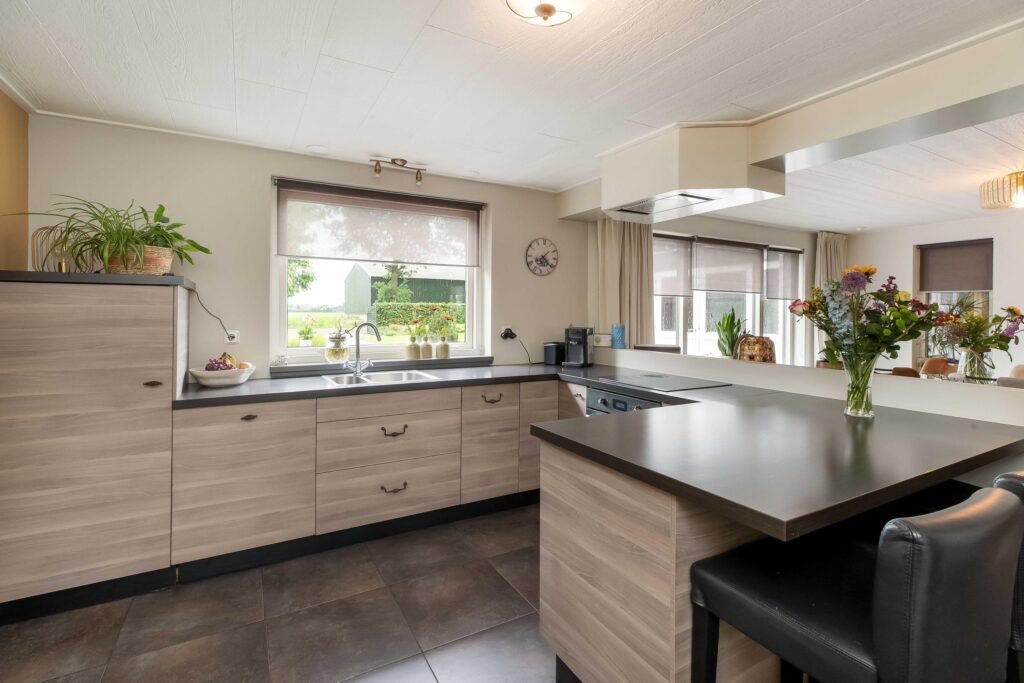 De keuken is voorzien van een U-opstelling met een barretje. Een raam zorgt voor lichtinval en een fijn zicht op de ruime voortuin. De volgende inbouwapparatuur is aanwezig: koelkast, vaatwasser, inductie kookplaat, afzuigkap en oven.