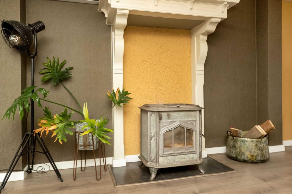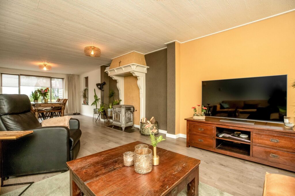 De woonkamer is aan zowel de voor- als achterzijde voorzien van een raam. De houtkachel met schouw zorgt voor een extra gezellige sfeer. In de zomermaanden kan er gekoeld worden met een airco, die in de winter gebruikt kan worden om te verwarmen.