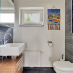 De eerste verdieping heeft een ruime overloop die toegang biedt tot 3 volwaardige slaapkamers, de badkamer en het separaat toilet. De badkamer is voorzien van een dubbele wastafel met badmeubel, een ruime inloopdouche met hand- en regendouche en een ligbad.