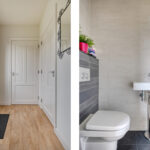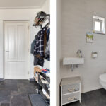 Aangrenzend aan de keuken bevindt zich een praktische achterhal met deels betegeld toilet, een schrobputje en een kast met de cv-installatie (Nefit, 2010).
