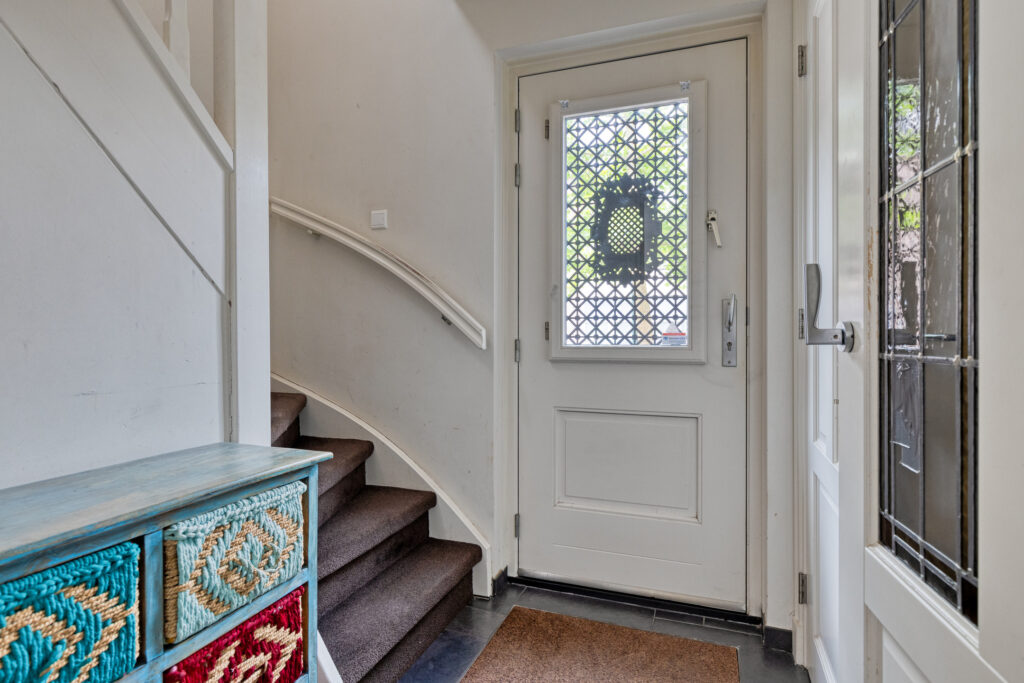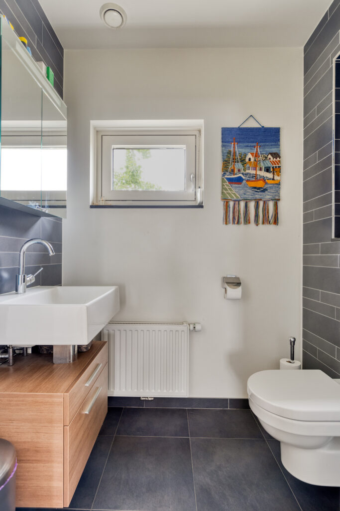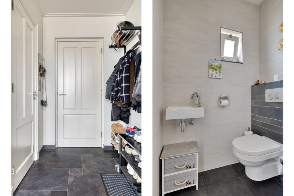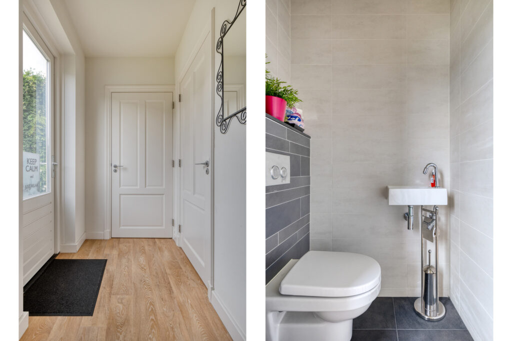 Aangrenzend aan de keuken bevindt zich een praktische achterhal met deels betegeld toilet, een schrobputje en een kast met de cv-installatie (Nefit, 2010).