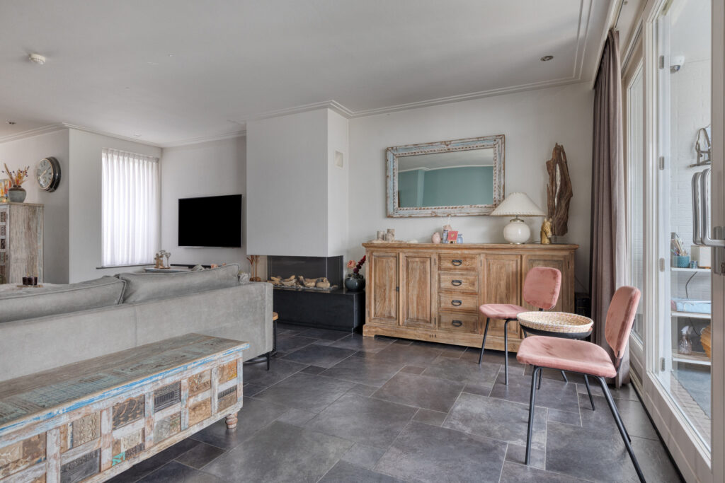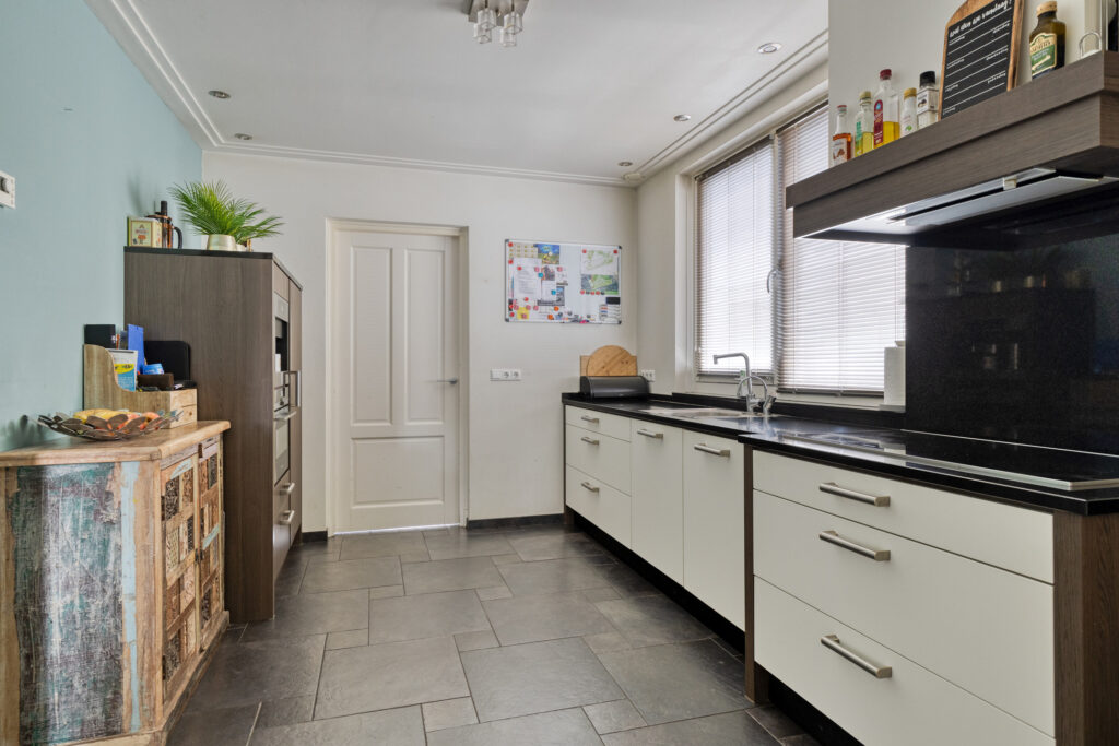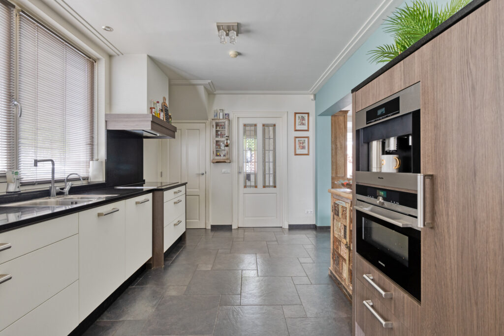 De gehele begane grond is afgewerkt met een tegelvloer en comfortabele vloerverwarming. De moderne keuken is compleet uitgerust met hoogwaardige inbouwapparatuur, waaronder een 5-pits inductiekookplaat, vaatwasser, koelkast, ingebouwd koffieapparaat en combi-oven.