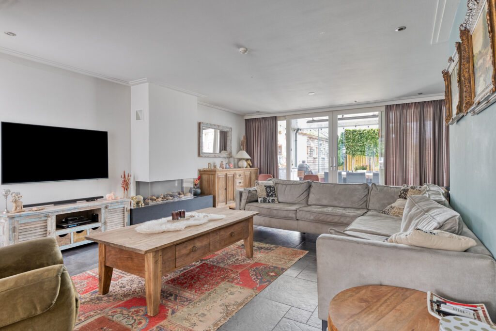 De woning is bereikbaar via een brede oprit met parkeergelegenheid voor meerdere auto’s. In de entreehal bevinden zich de trapopgang naar de eerste verdieping en de doorgang naar de moderne keuken. De lichte woonkamer beschikt aan de voorzijde over een gezellige eethoek. De zithoek is aan de achterzijde gesitueerd en voorzien van een sfeervolle gashaard en een schuifpui naar de overkapping.