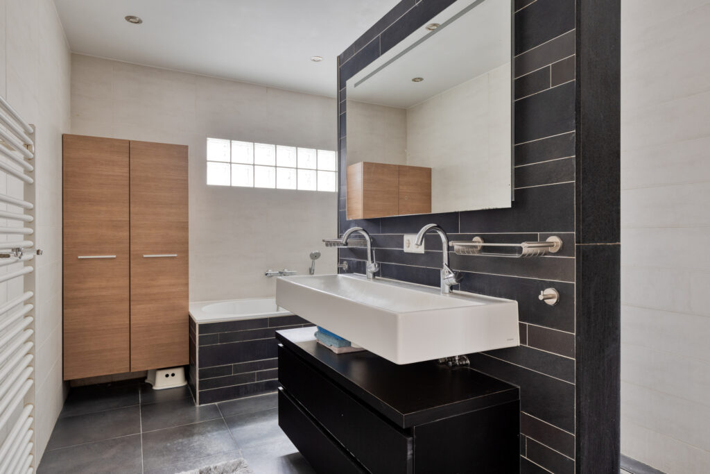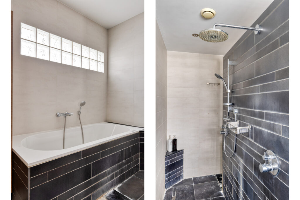 De eerste verdieping heeft een ruime overloop die toegang biedt tot 3 volwaardige slaapkamers, de badkamer en het separaat toilet. De badkamer is voorzien van een dubbele wastafel met badmeubel, een ruime inloopdouche met hand- en regendouche en een ligbad.