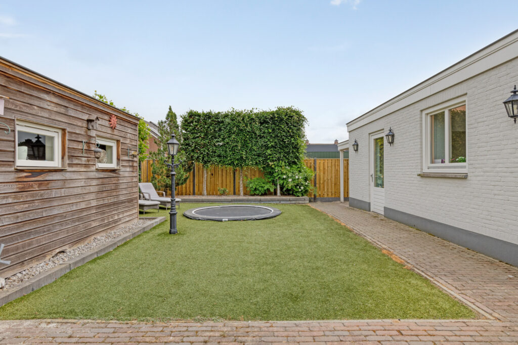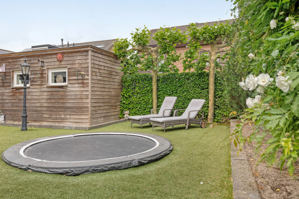 De fraai aangelegde en onderhoudsvriendelijke achtertuin is gelegen op het oosten en meet circa 17 bij 12 meter. Dankzij de ruime opzet en gunstige ligging geniet je hier volop van de zon. De tuin is voorzien van bestrating en kunstgras. Direct aan de woning grenst een sfeervolle overkapping met lichtstraat en ingebouwde spots. Daarnaast is er een ruime tuinberging aanwezig.